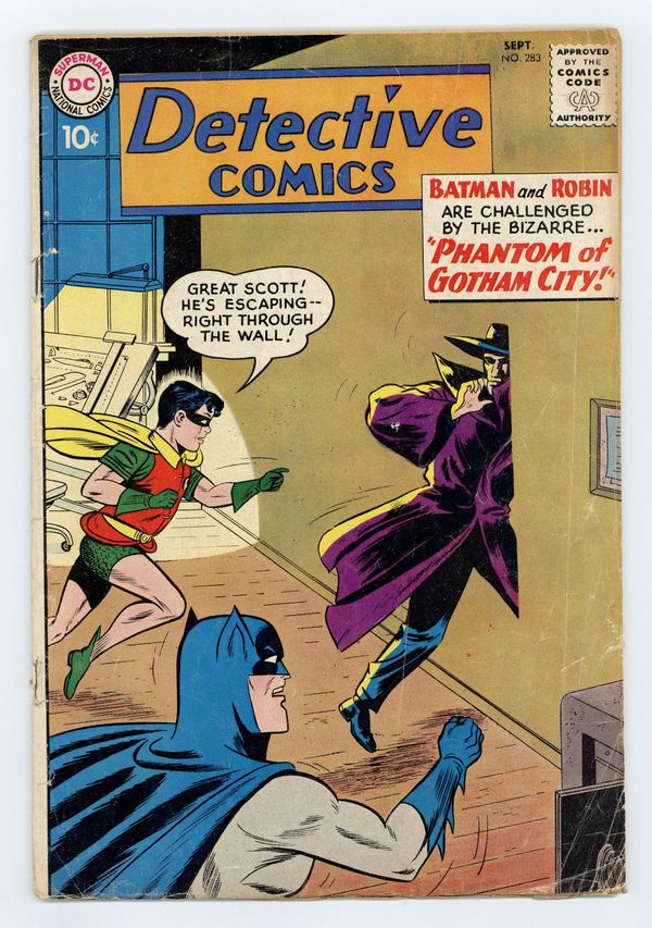 Cover art by Sheldon Moldoff. "The Phantom of Gotham City" starring Batman and Robin, pencils by Sheldon Moldoff, inks by Charles Paris; Batman and Robin face a Phantom who can walk through walls and direct strange and terrible energies at them, but who may not be a villain; When the Phantom deliberately saves Robin's life, Batman prepares a trap to learn the secret identity of the Phantom and he finally realizes that he is an alien. Bike Safety = Bike Fun! public service announcement, script by Jack Schiff, art by Bernard Baily. "Captives on the Moon" starring Roy Raymond TV Detective, art by Ruben Moreira. Half-page Lefty Looie story by Henry Boltinoff. "The Amazing One-Man Crew" starring John Jones Manhunter from Mars, script by Jack Miller, art by Joe Certa; Manhunter volunteers to crew a cargo ship single-handedly after the real crew quits because of a jinx. 36 pgs., full color. Cover price $0.10.