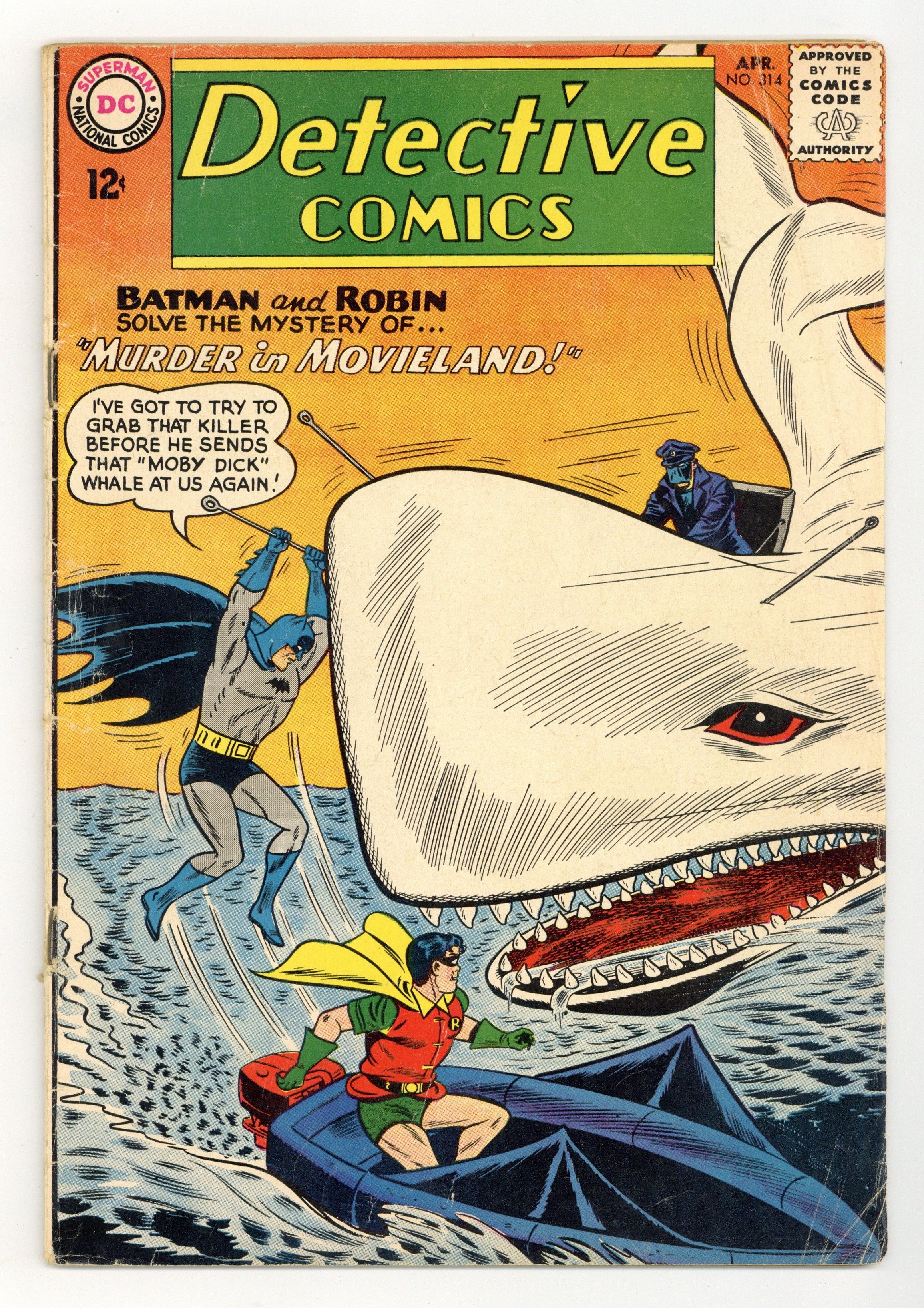 Tags: Batman$17.00Cover art by Sheldon Moldoff. Murder in Movieland starring Batman and Robin, pencils by Sheldon Moldoff, inks by Charles Paris; Batman and Robin try to nab a disgruntled actor before he can murder three movie studio heads while reprising some of his greatest screen roles; The actor almost succeeds in killing his victims, but they are all saved by Batman; However, some evidence comes to light that might prove that the actor is in fact innocent and that somebody is trying to frame him; Batman investigates further and gathering enough clues, he deduces the place where the criminal would strike next; Batman once again prevents the man from murdering and finally learns that he is in fact the actor and that the previously uncovered evidence was placed by the man, in order to throw away suspicion. Salute to Our Fellow Citizens of Puerto Rico! public service announcement, script by Jack Schiff, art by Sheldon Moldoff. "J'onn J'onzz vs. John Jones" starring John Jones Manhunter from Mars, art by Joe Certa; A Saturnian criminal disguises himself as Jones, not realizing he's the Manhunter. Don't Shoot - I Surrender! Article. 36 pgs., full color. Cover price $0.12.