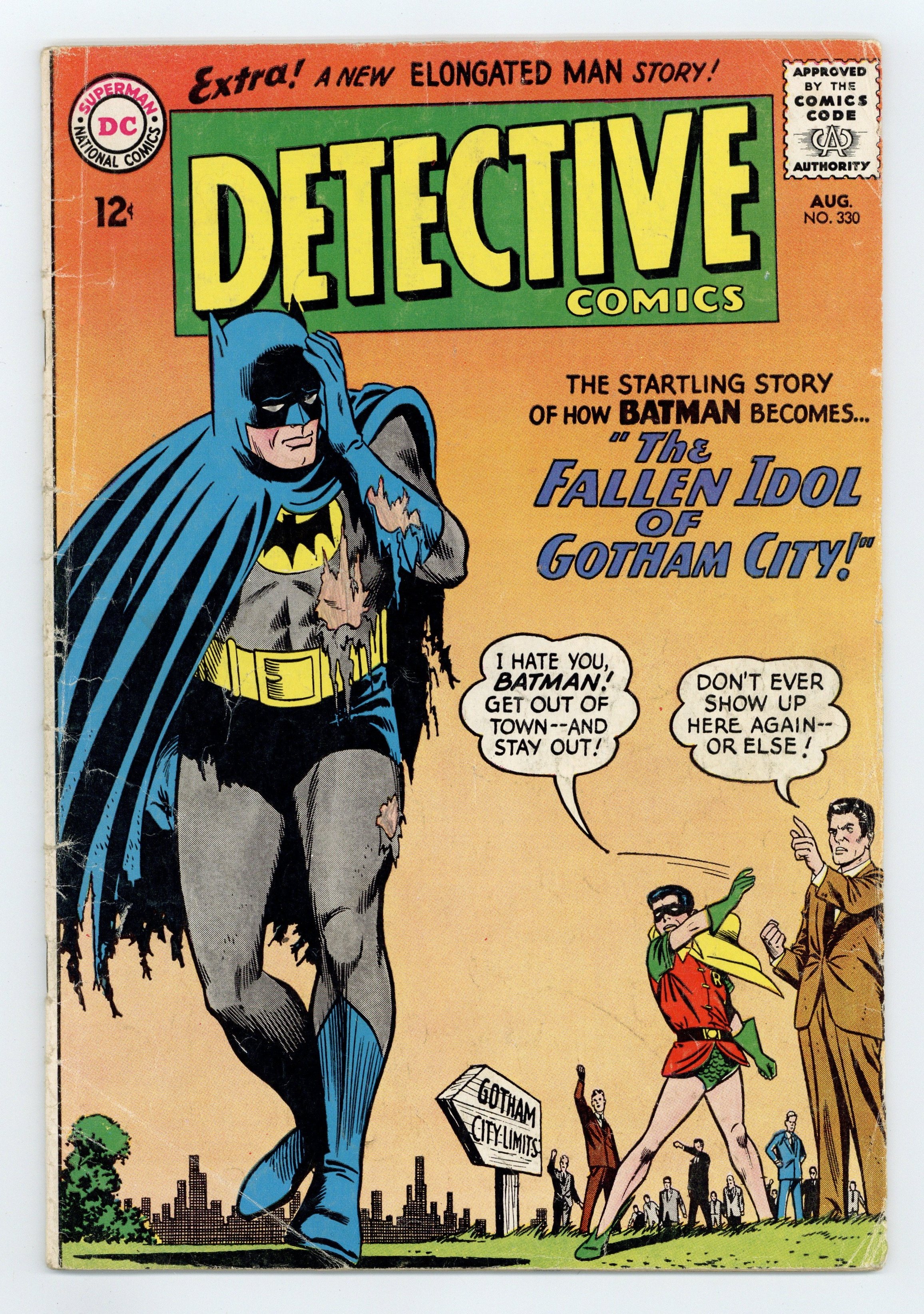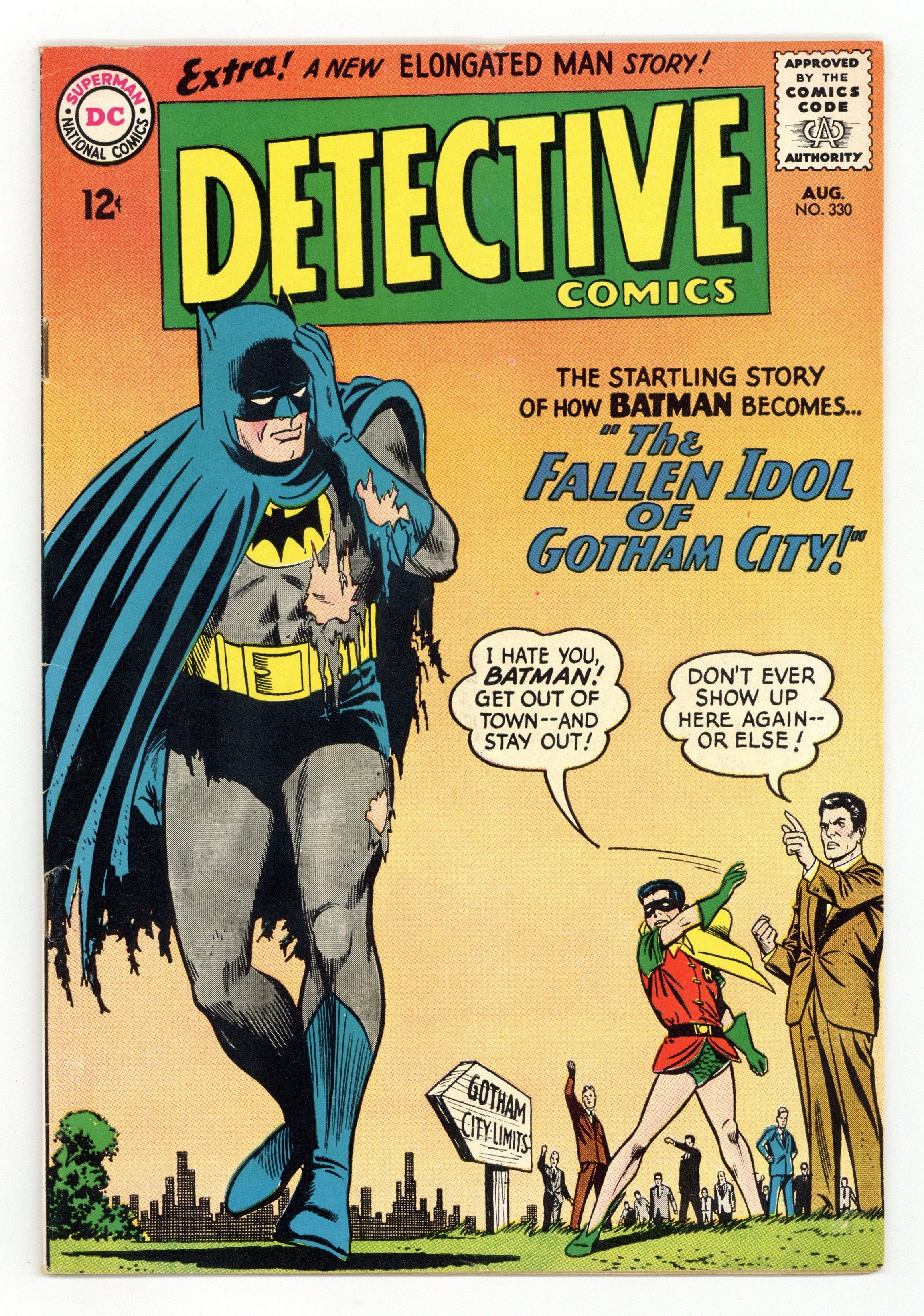 Written by John Broome. Art by Sheldon Moldoff (ghost for Bob Kane) and Joe Giella. Cover by Carmine Infantino and Joe Giella. The Fallen Idol of Gotham City!; Batman and Robin investigate a series of incidents and discover that everyone involved had eaten at Golden Roost that day; the Dynamic Duo discover that a spy ring is using a chemical to make people attack each other. Written by Gardner Fox. Art by Carmine Infantino. Desert Double-Cross!; With Sue and the Parkers held hostage, Ralph The Elongated Man Dibny has to steal the Banley Jewels. Rx Against Accidents! public service announcement by Jack Schiff, art by Sheldon Moldoff. Rocky and Bullwinkle star in a one-page Cheerios ad. 36 pages, full color. Cover price $0.12.