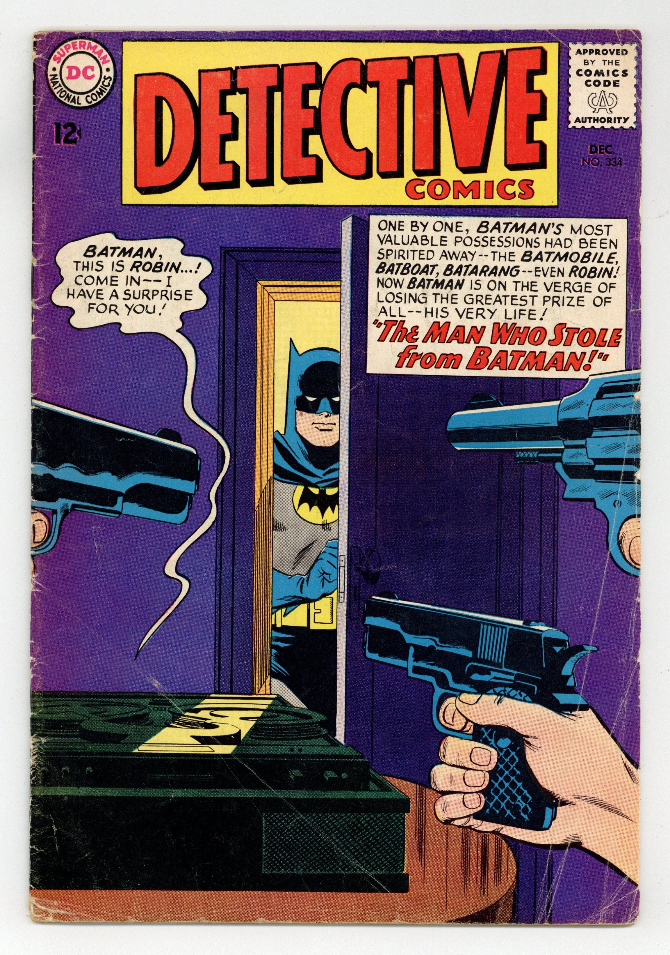 Tags: Batman, Elongated Man$10.00Written by Gardner F. Fox. Art by Sheldon Moldoff (ghost for Bob Kane) and Joe Giella. Cover by Carmine Infantino and Joe Giella. The Man Who Stole from Batman!; A new and unusual villain makes him presence known by stealing from the Batman: his Batmobile, Bat-a-Rang, and Bat-Boat, yet Batman cannot figure out WHY he would do such a thing; 1st appearance of the Outsider. Written by Gardner F. Fox. Art by Carmine Infantino and Sid Greene. Battle of the Elongated Weapons! starring Ralph Elongated Man Dibny. Casey the Cop humor page by Henry Boltinoff. Children of Tomorrow! public service announcement by Jack Schiff, art by Bernard Baily. Rocky and Bullwinkle star in a one-page Cheerios ad. 36 pages, full color. $0.12. Cover price $0.12.