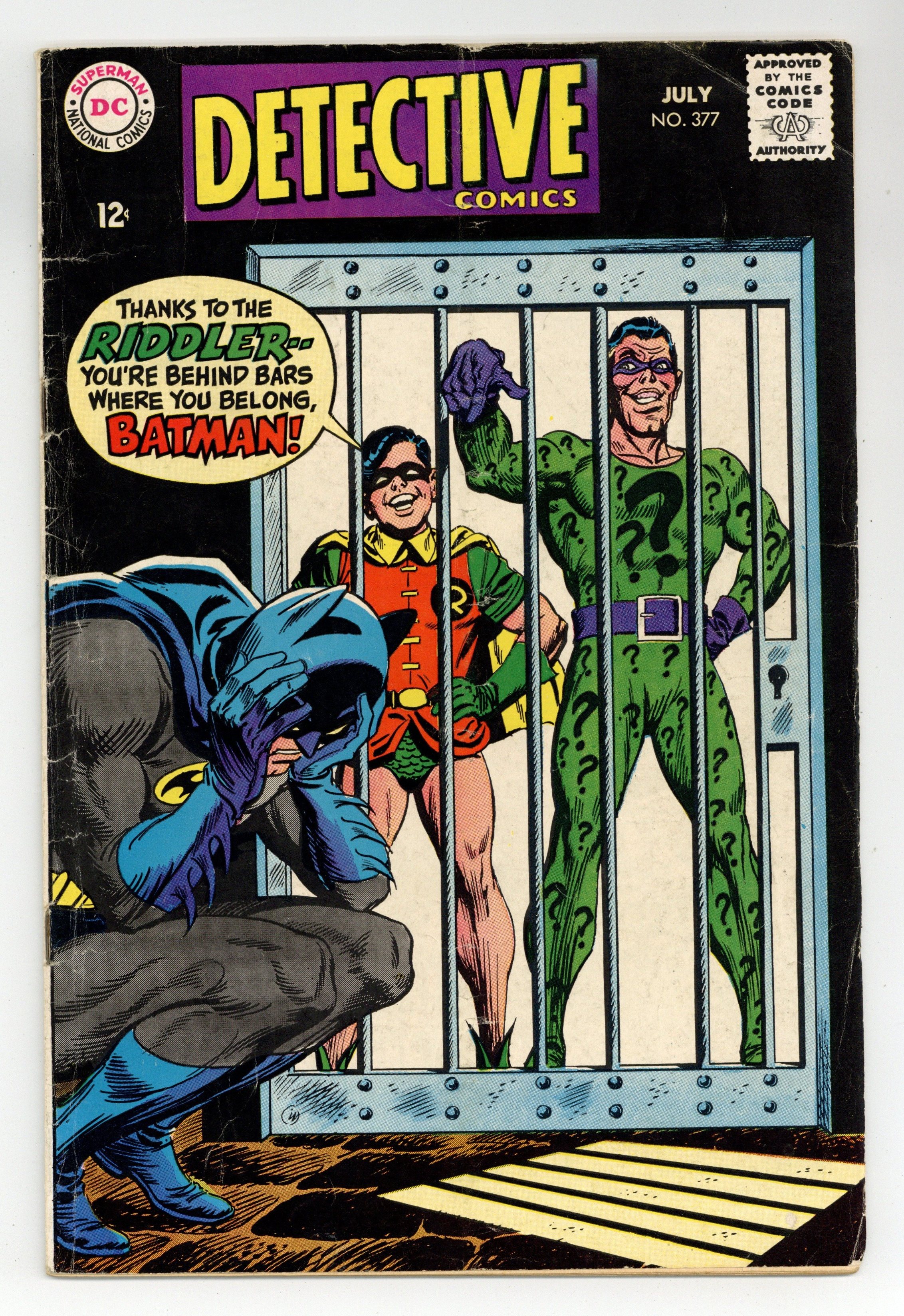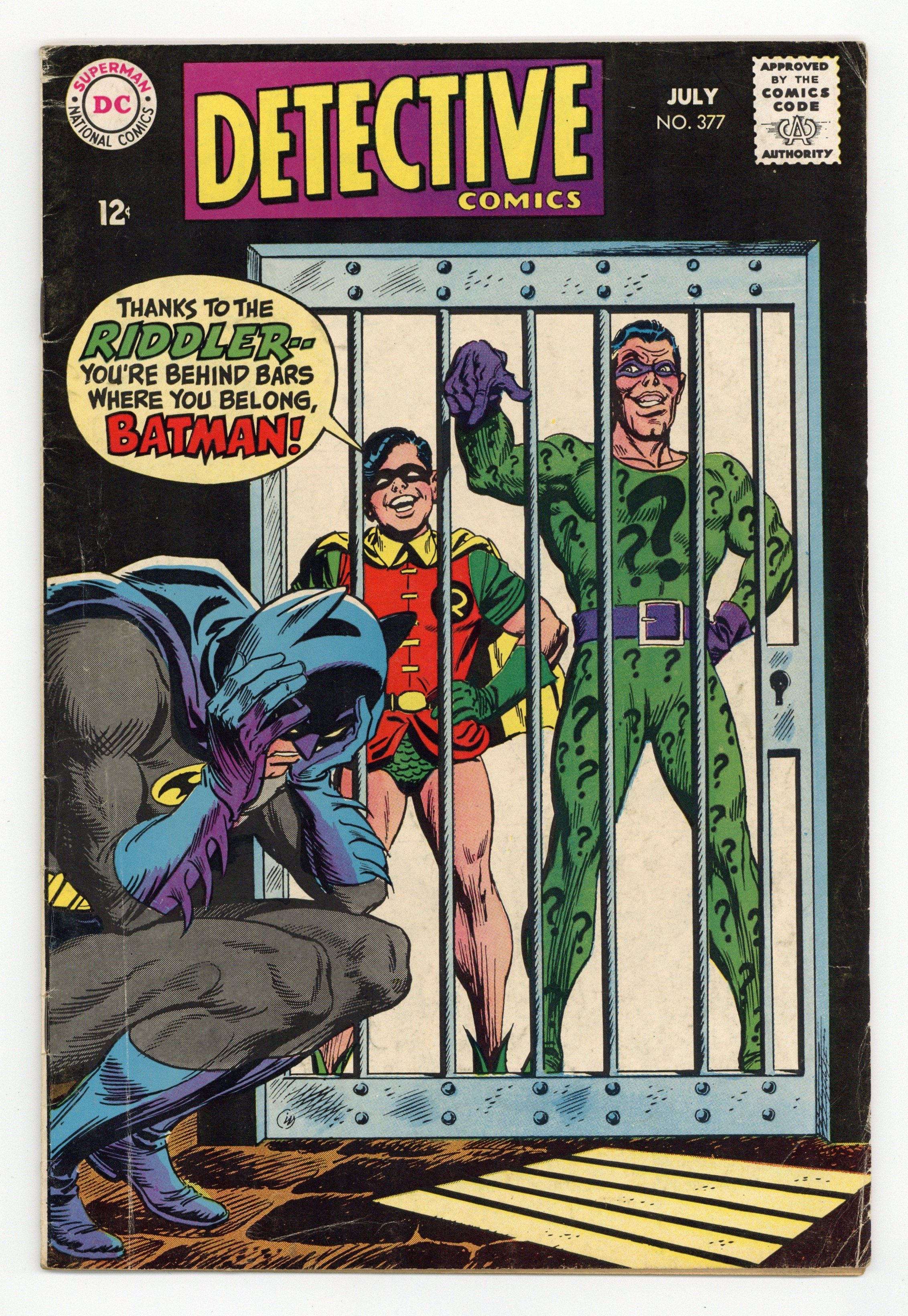 Written by Gardner Fox. Art by Frank Springer and Sid Greene. Cover by Irv Novick. The Riddler's Prison-Puzzle Problem!; Batman battles the Riddler, who feels compelled to leave clues for Batman regarding his future robberies. Written by Gardner Fox. Art by Murphy Anderson. The Case of the Clumsy Crook!; a thief named Taps Carter, believing his crime career is destined to fail, decides to commit one more crime; he steals a gold bracelet from Ralph Elongated Man Dibnys suitcase. Cap's Hobby Hints by Henry Boltinoff. Missive from letter hack Guy H. Lillian III. 36 pages, full color. $0.12. Cover price $0.12.