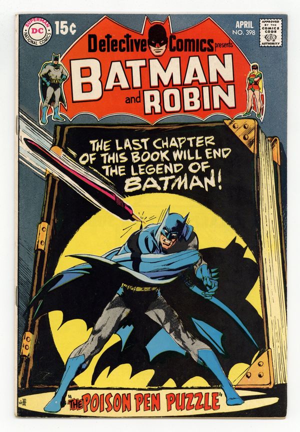 Cover by Neal Adams. "The Poison-Pen Puzzle!," script by Frank Robbins, pencils by Bob Brown, inks by Joe Giella; On a trip to Hollywood to check out a movie studio on whose board he now sits, Bruce Wayne must become Batman to solve the mystery of a novelist slain by a literally poisoned pen. Fingerprint Facts page. "Moon-Struck," script by Frank Robbins, pencils by Gil Kane, inks by Vince Colletta; While attending a science lecture as Dick Grayson, Robin sees a lunar rock turn another student green; Is it strange radiation from the moon, or a prank? Letter to the editor from Mike Barr. 36 pgs., full color. $0.15. Cover price $0.15.