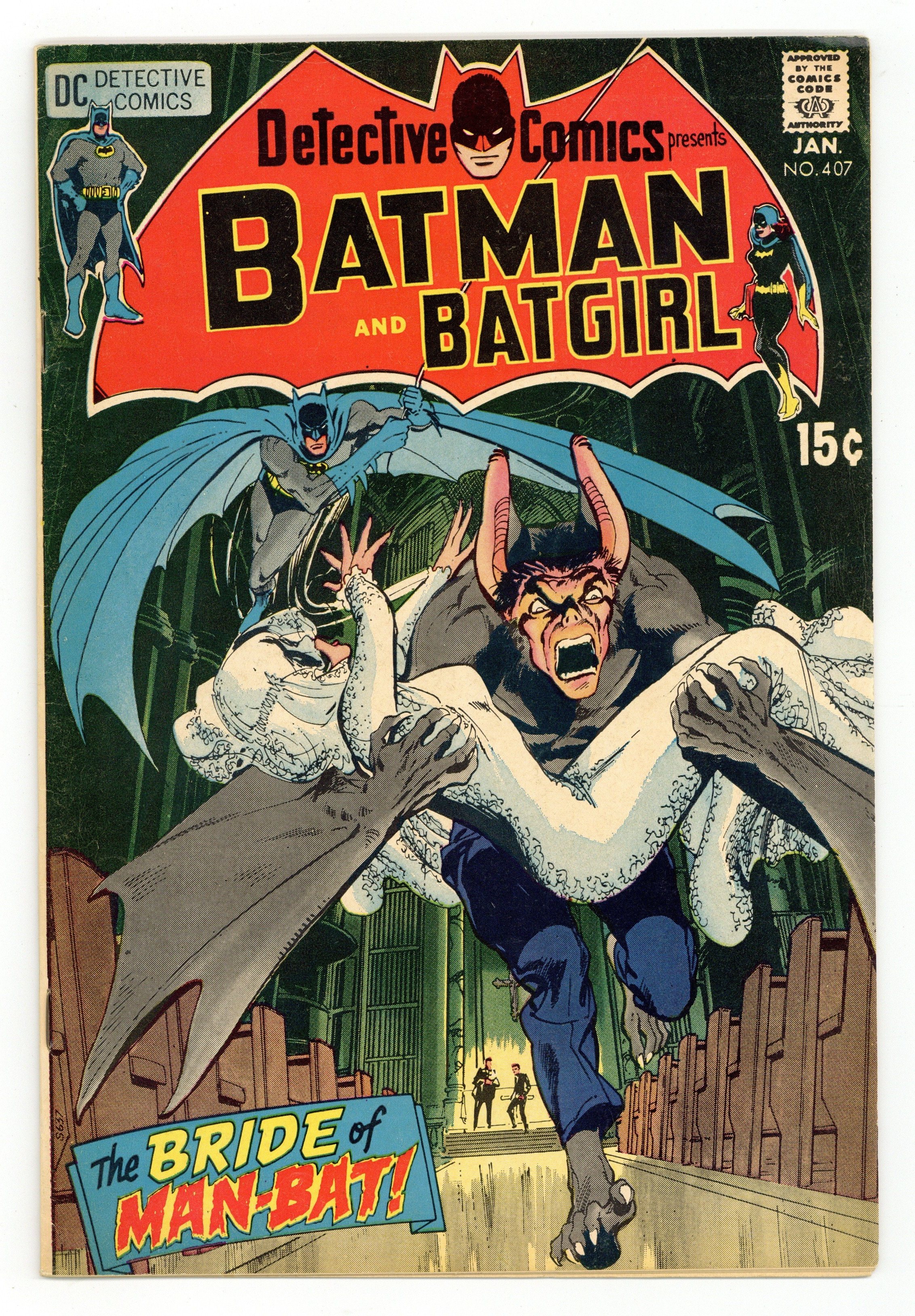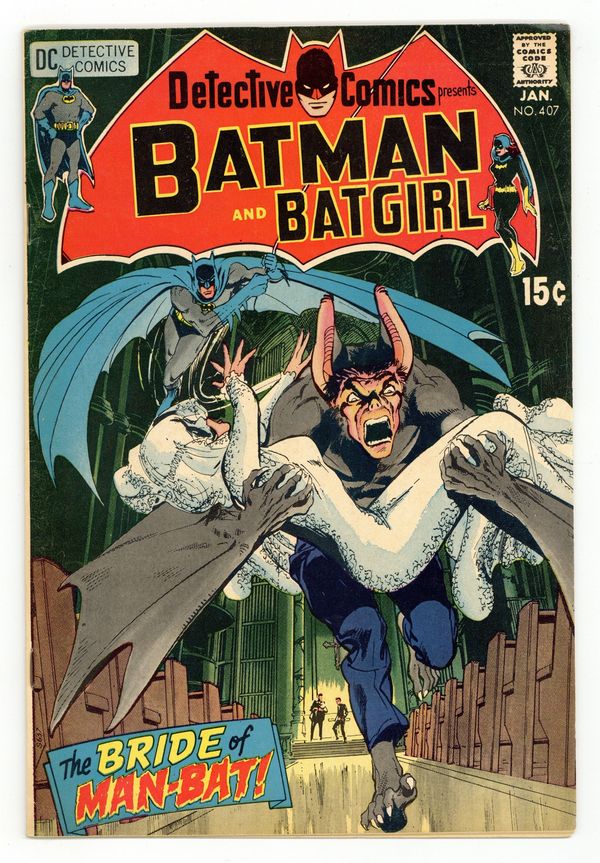Tags: Batman$70.00Cover by Neal Adams. "Marriage: Impossible," script by Frank Robbins, pencils by Neal Adams, inks by Dick Giordano; When Batman learns about the pending marriage between Kirk Langstrom and Francine Lee, he races down to the cathedral to stop the wedding; Interrupting the ceremony, he pulls a mask off Langstrom's head, revealing the face of the Man-Bat. "One of Our Landmarks Is Missing!," script by Frank Robbins, pencils by Gil Kane, inks by Vince Colletta; Continuing from last issue... Batgirl had stumbled upon the fact that the leader of the group Peaceful Protest has begun resorting to bombings to get the groups message across, this revelation however has gotten her trapped in a room where if she to step off a circle of floor in the middle of the room the entire place will explode. Letters to the editor from writers Alan Brennert and Arlen Schumer. 36 pgs., full color. $0.15. Cover price $0.15.