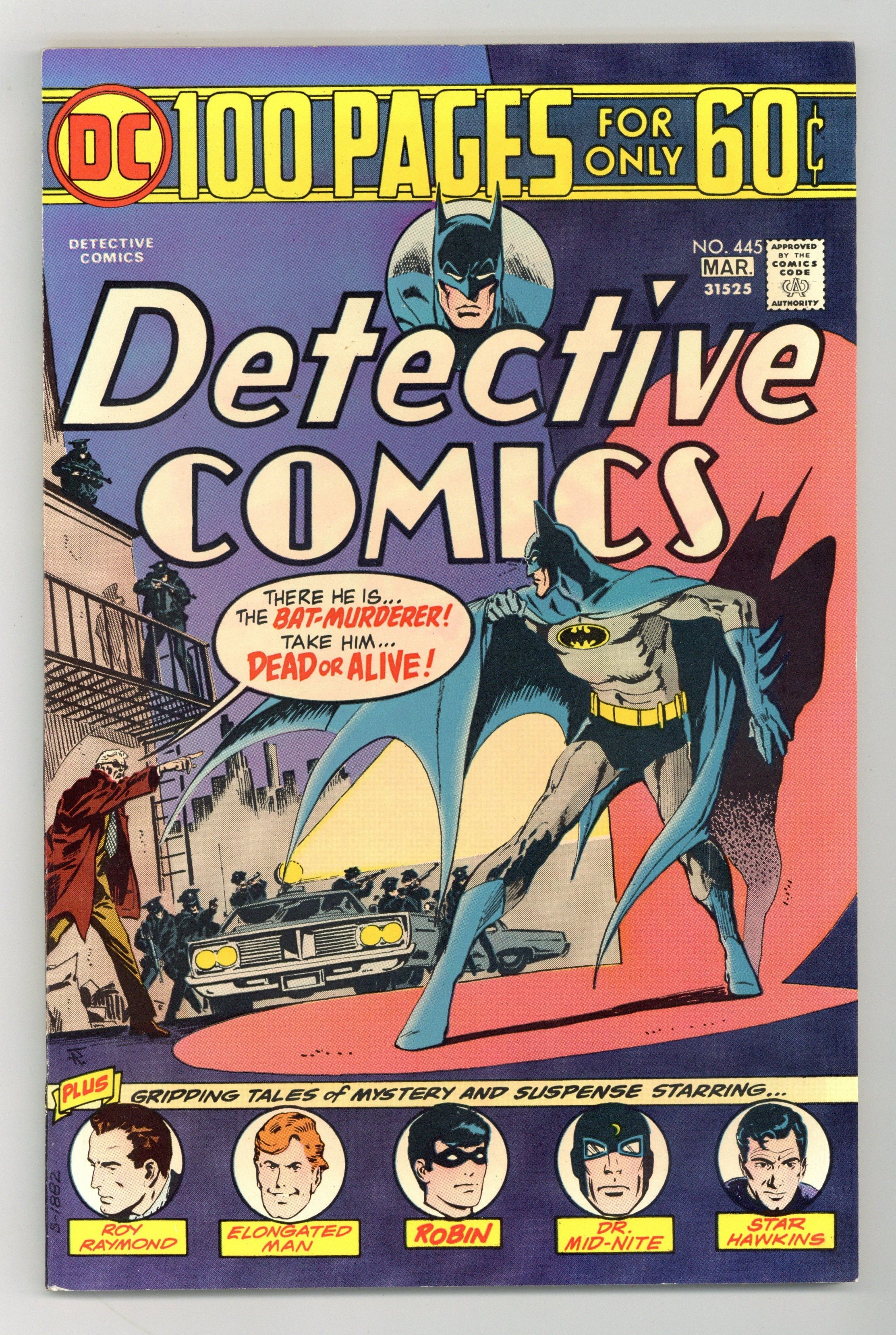 Last 60-cent 96 Page Super Spectacular. In a new Batman story, the Caped Crusader is wanted for murder after being accused of murdering Talia, the daughter of his old enemy, Ra's al Ghul, in "Break-In at the Bighouse!" (script by Len Wein, art by Jim Aparo). New Robin story, "The Touchdown Trap!" (script by Bob Rozakis, art by Mike Grell). Star Hawkins reprint, "The Case of the Robot-Spy!" (from Strange Adventures 116; script by John Broome, pencils by Mike Sekowsky, inks by Bernard Sachs). Marty Moran, Headline Hunter reprint, "The Human Bomb!" (from Big Town 2; art by Dan Barry). Manhunters Around the World reprint, "The Swiss Border Patrol!" (from Star-Spangled 105). Perfect Crime Mystery reprint, "The Case of the Crooked Gambler!" (from Gang Busters 5). Roy Raymond, TV Detective reprint, "The Man Who Slept 200 Years!" (from Detective 222; art by Ruben Moreira). Elongated Man reprint, "Ten Miles to Nowhere!" (from Detective 327; script by Gardner Fox, art by Carmine Infantino). "24 Hours From Death" reprint (from Gang Busters 25). Dr. Midnite Golden Age reprint, "Case of the Talking Shadows!" (from All-American 101). Aparo cover. 100 pgs. Cover price $0.60.