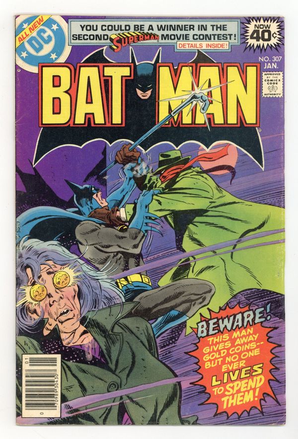 Tags: Batman$36.001st appearance of Lucius Fox. Cover art by Jim Aparo. "Dark Messenger of Mercy!", script by Len Wein, pencils by John Calnan, inks by Dick Giordano; Lucius Fox handles the day-to-day transactions of the Wayne Foundation to Fox free up Wayne's schedule for his Batman activities; Batman pursues a killer who places poisoned gold coins over his victims' eyes. Hostess snack cakes ad with Superman. Letter from comics write Cat Yronwode. Daily Planet Extra Volume 78 Issue 40 Week of October 9, 1978; Information on Superboy and the Legion of Super-Heroes #247, The Brave and the Bold #146, comics on sale the week of October 23, Ask the Answer Man! and Fred Hembeck strip featuring Elongated Man. 36 Pages, Full Color. Cover price $0.40.