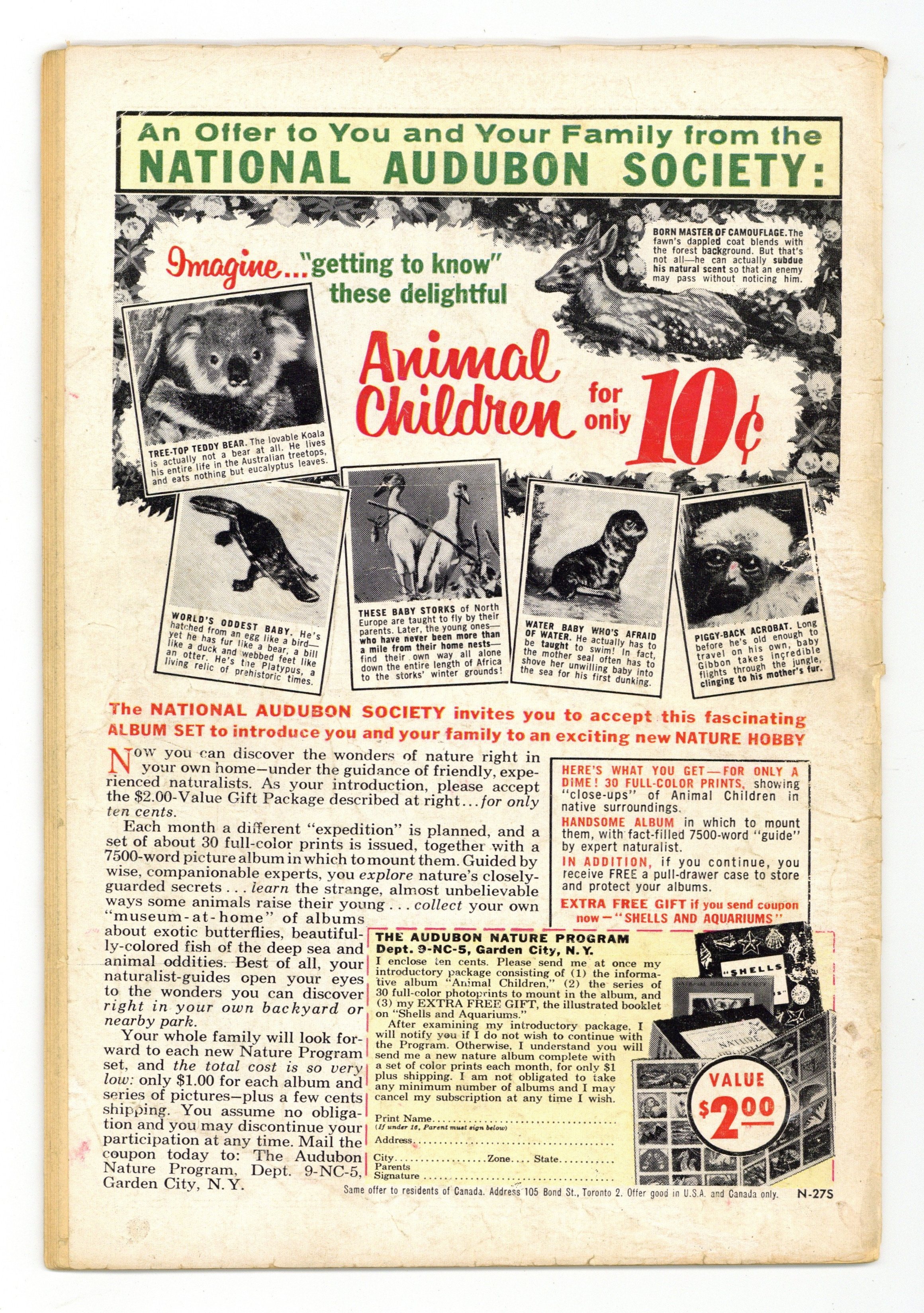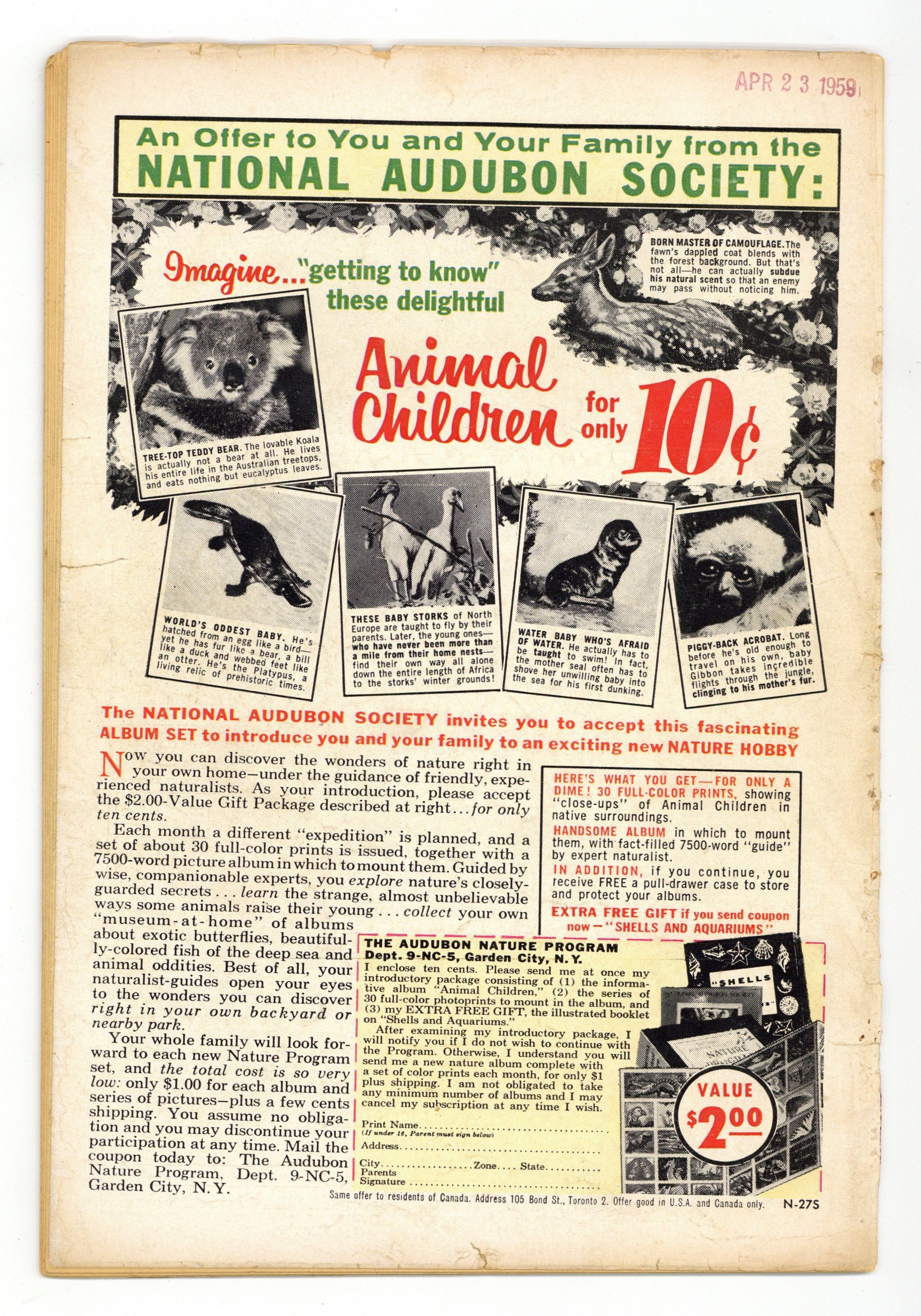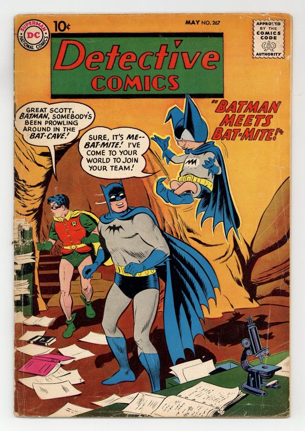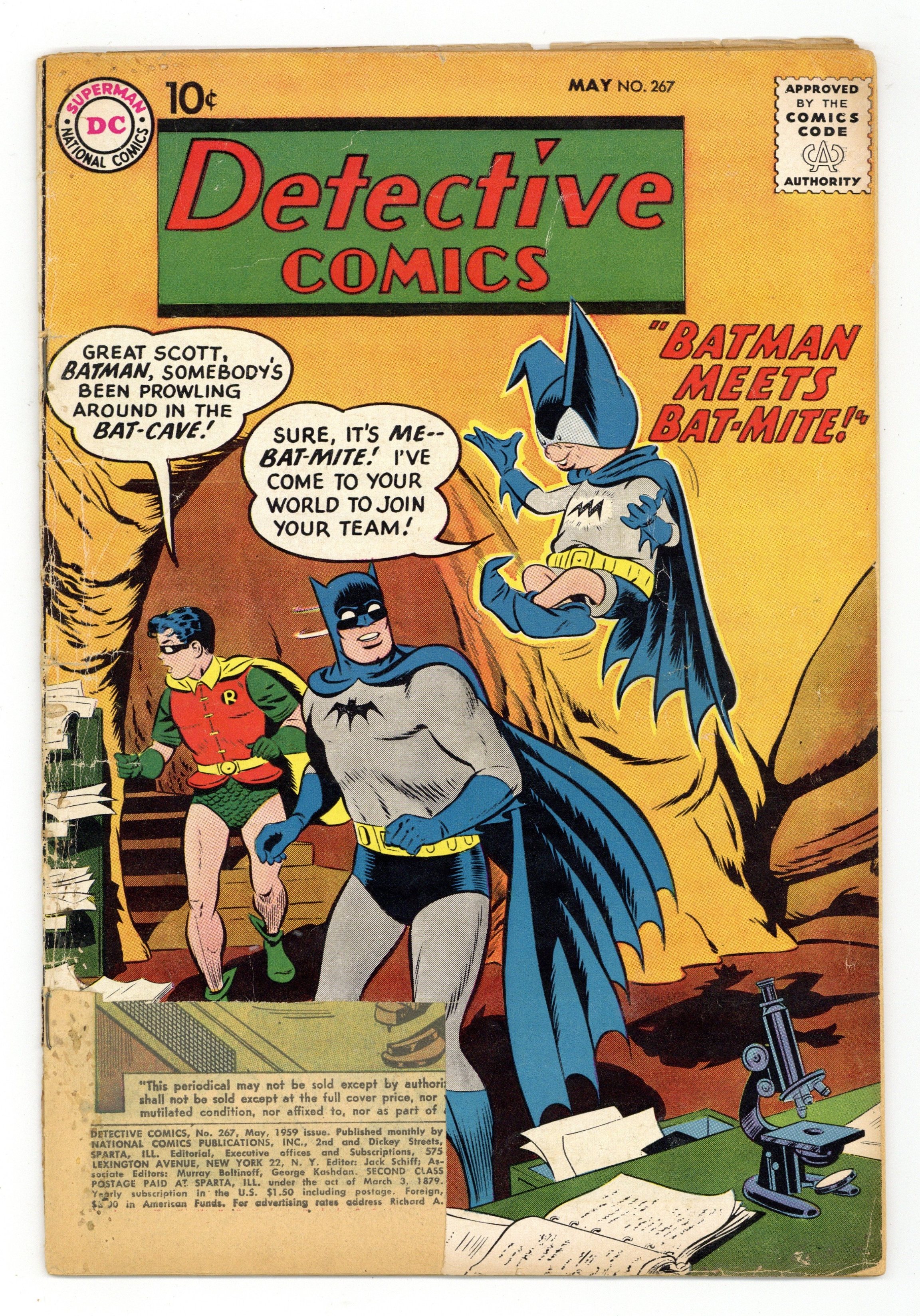 1st appearance of Bat-Mite. Cover pencils by Curt Swan, inks by Stan Kaye. "Batman Meets Bat-Mite" starring Batman, Robin, and Bat-Mite (intro), script by Bill Finger, pencils by Sheldon Moldoff, inks by Charles Paris; Preparing to go off on patrol, Batman and Robin find the Bat-Cave disturbed and meet the zany and humorous Bat-Mite, an admirer of Batman's from another dimension; Bat-Mite wants to join Batman and Robin in their fight against crime. Ad for Showcase #20. Warden Willis humor page by Henry Boltinoff. "The Mystery of the Magic Sea!" starring Roy Raymond TV Detective, art by Ruben Moreira; When an earthquake exposes a portion of an underground sea, a small town hopes it will be a boon to its tourism business; But a legend warns that if a person swims too deep in the water, he'll turn into a fish; Roy Raymond films the attempts of two townspeople to disprove the legend for Impossible but True. Clyde Beatty and Cole Bros Circus at Palisades Amusement Park ad starring Superman. "John Jones' Farewell to Earth" starring John Jones Manhunter from Mars, art by Joe Certa; Jovians come to Earth searching for a criminal but they need Manhunter's help because their weakness is water and it's raining. 36 pgs., full color. Cover price $0.10.