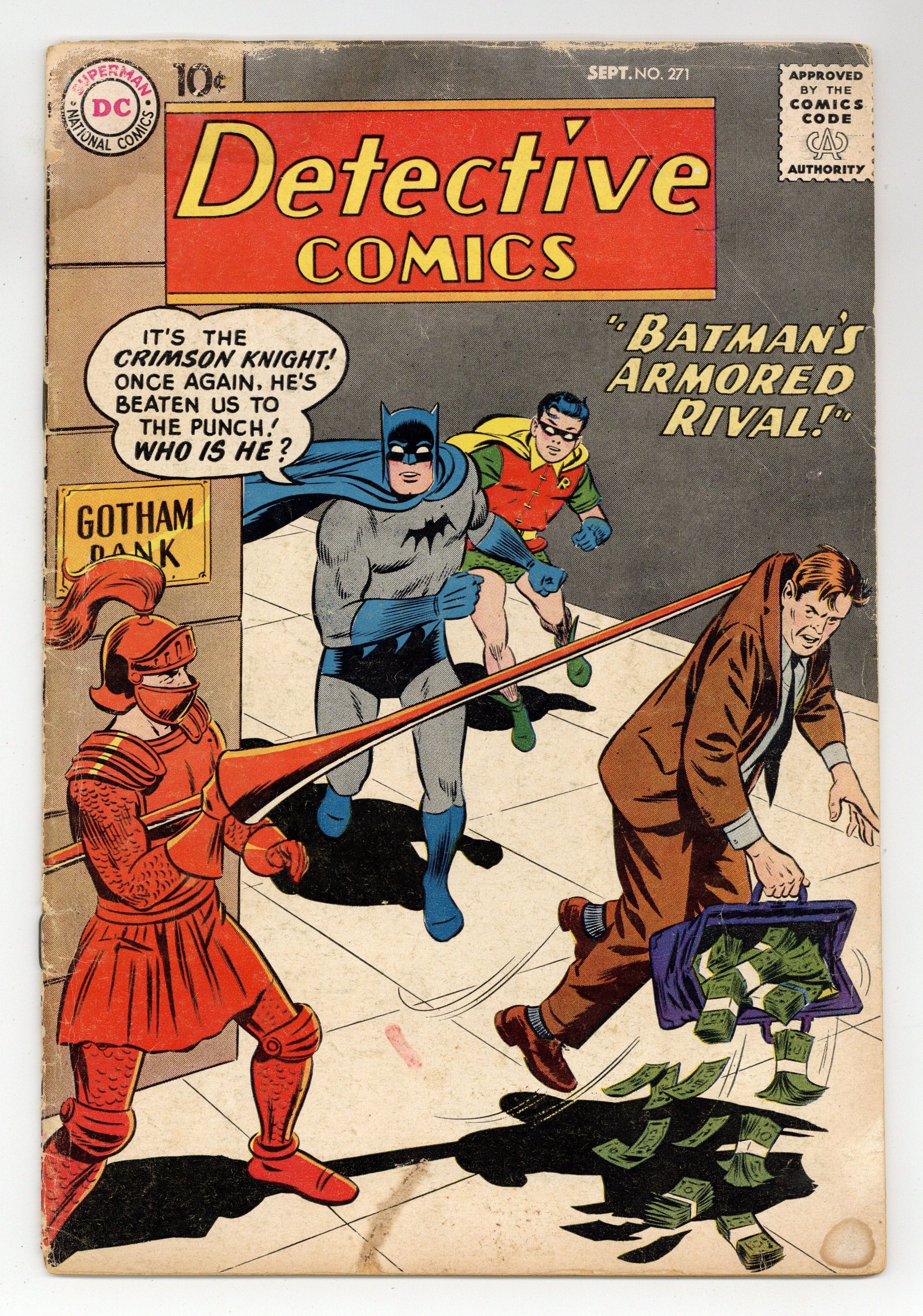 Cover pencils by Curt Swan, inks by Stan Kaye. "Batman's Armored Rival" starring Batman, Robin, and the Crimson Knight (intro), script by Dave Wood, art by Sheldon Moldoff; Batman and Robin are assisted by a new hero, the Crimson Knight; But whose side is the mystery man really on? Water: A Good Friend or a Deadly Enemy--Depending on You! public service announcement, script by Jack Schiff, art by Bernard Baily. "The Incredible Cave Creatures" starring Roy Raymond TV Detective, script by Jack Miller, art by Ruben Moreira. "The Lost Identity" starring John Jones Manhunter from Mars, script by Jack Miller, art by Joe Certa; Jones loses his ability to change to Earthman form; vs. Rocky Wheeler (intro, villain) and The Hanshaw Gang. 36 pgs., full color. Cover price $0.10.