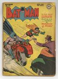 Cover by Dick Sprang. "The Marathon of Menace!" starring Batman and Robin, script by Bill Finger, pencils by Dick Sprang (as Bob Kane); Racer Marty Steele is banned from racing when doctors discover he has a bad heart; But he has plans to compete anyway under another name, whilst his erstwhile opponent is a blind scientist; The prize for the winner is $250,000, a sum that Roy Damon hopes to take home in order to allow others who are blind to build new and better lives for themselves. "Ally Babble and the Four Tea Leaves!" starring Batman and Robin, script by Bill Finger, pencils by Dick Sprang (as Bob Kane); Ally visits Madame Patio for a free tea leaf reading and explains to him the meaning of the four tea leaves of fate: money, a girl, a ship's deck, and happy faces; By a quirk of fate, these all come true, but not the way Ally imagined. "Nobody Knows" text story by Tom Patrick. "Tired Tracks," art by Jerry Robinson; Alfred makes a study of tires and the tracks they make; Too bad for him the car he is examining belongs to crooks! "The Master Vs. the Pupil!", script by Bill Finger, pencils by Dick Sprang (as Bob Kane); Robin's bragging about his prowess in crook hunting leads Batman to disguise himself as a jewel thief and have Robin attempt to track him down. 52 Pages, Full Color. Cover price $0.10.