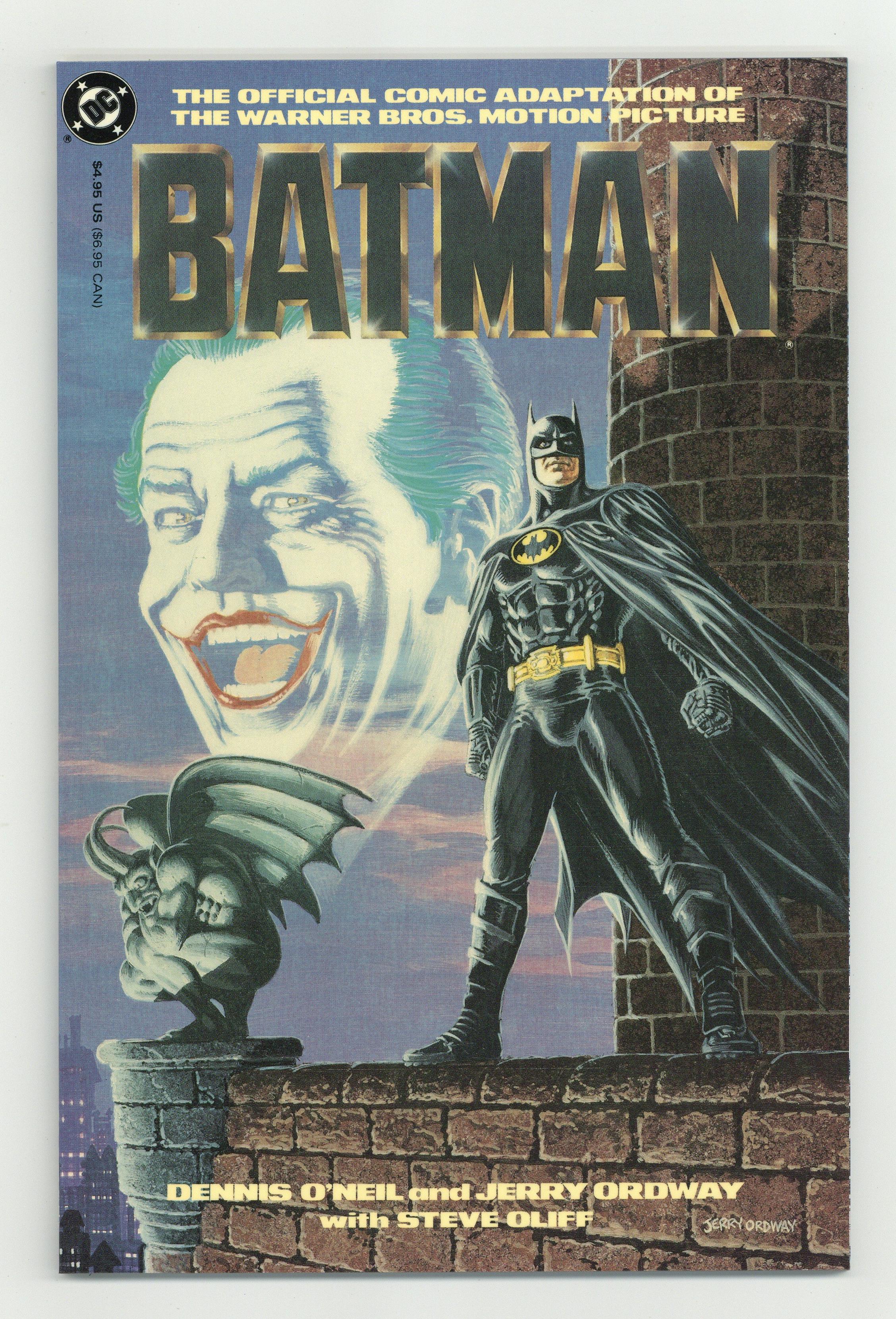 Deluxe Format. Written by Dennis O'Neil, with art by Jerry Ordway. This prestige format one-shot is an adaptation of Tim Burton's 1989 Batman feature film, which starred Michael Keaton as Bruce Wayne/Batman, Jack Nicholson as The Joker, Kim Basinger as Vicky Vale, and Michael Gough as Alfred. Cover price $4.95.