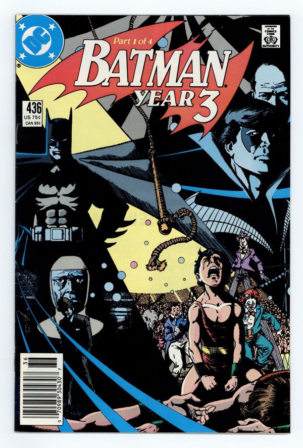 First Printing. Newsstand Edition. 1st appearance of Tim Drake. Cover art by George Perez. "Batman Year 3 (Part 1 of 4): Different Roads," script by Marv Wolfman, pencils by Pat Broderick, inks by John Beatty; Someone is killing off Gotham's mob bosses, and Batman keeps arriving too late to prevent the murders; Boss Zucco is up for parole, and Alfred Pennyworth pleads with the parole board not to let him free; Nightwing returns to Gotham, having heard that Batman's sanity is eroding, and sets off in search of his mentor; The Post-Crisis origin of Robin (Dick Grayson) in flashback. 36 Pages, Full Color. Cover price $0.75.