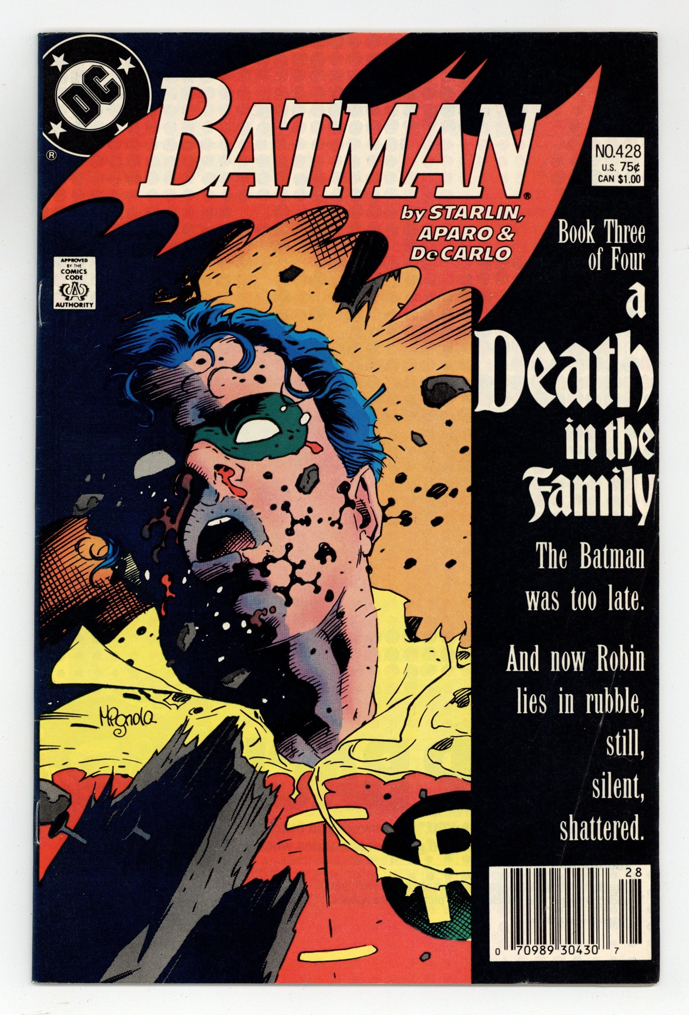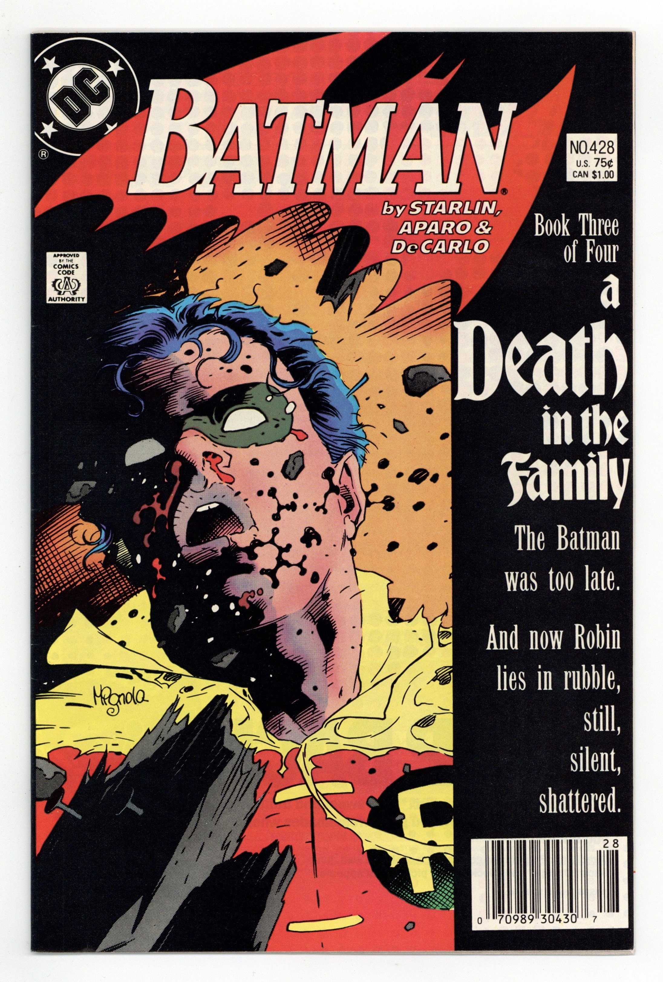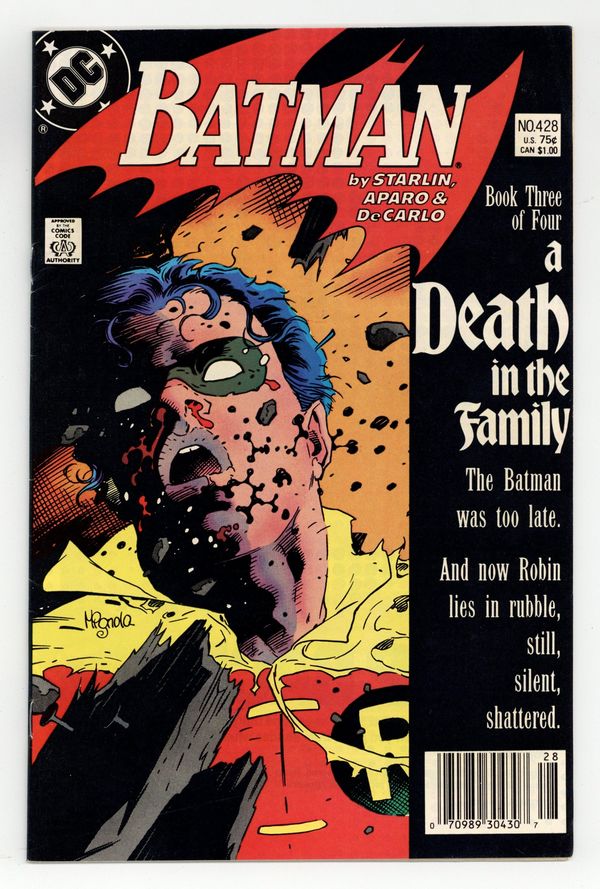Ends Mar 2 7:31 PM CST Bid History 7 bids Current Bid $45 Your Secret Max Bid If you'd like to bid, please log in or register. First printing. Newsstand Edition. Cover art by Mike Mignola. "A Death in the Family" part 3 of 4, script by Jim Starlin, pencils by Jim Aparo, inks by Mike DeCarlo; Death of Sheila Haywood; Burial of Sheila Haywood and Jason Todd; The Joker becomes the Iranian Ambassador to the U.N. Results of Phone Poll as to whether Robin dies this issue or not. NOTE: Most issues from 397-432 were reprinted in 1989 and sold in multipacks. These 2nd and 3rd prints have back cover ads dated 1989. 36 Pages, Full Color. Cover price $0.75.