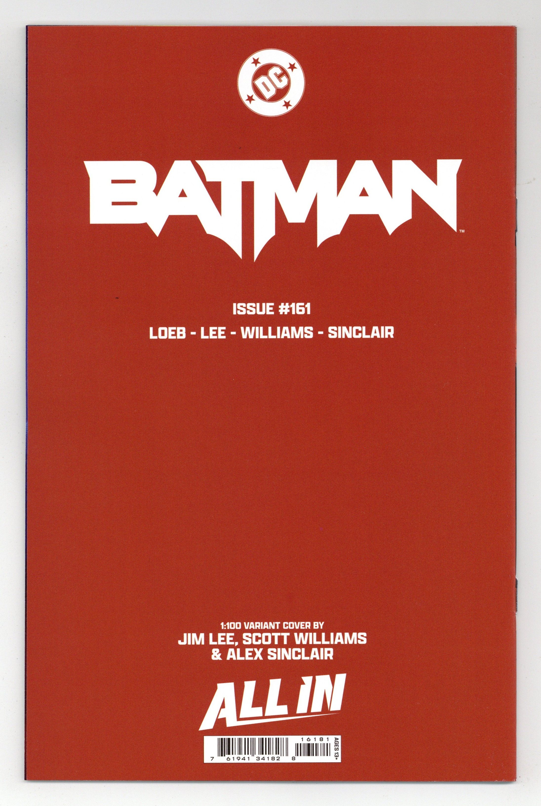 $41.00Limited 1 for 100 Retailer Incentive Variant Cover. Written by Jeph Loeb. Art by Jim Lee, Scott Williams. Cover by Jim Lee, Scott Williams. H2SH WITH JEPH LOEB AND JIM LEE PART 4! Batman's battle with Hush takes a dark turn when Damian (Robin) and Bane team up! 40 pages, full color. Rated T+ Cover price $5.99.