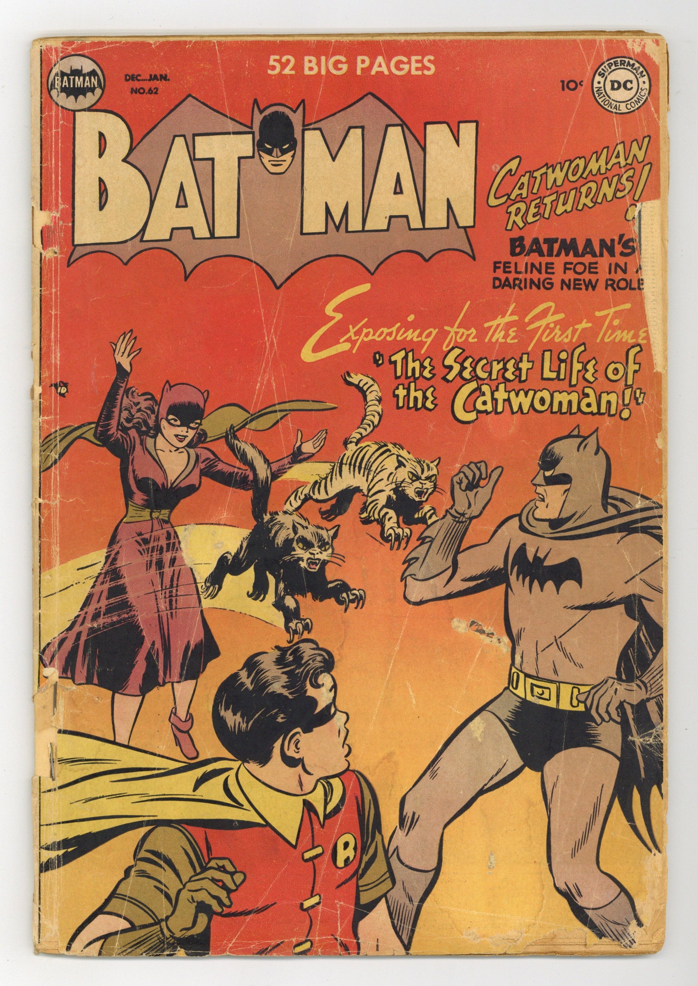 Cover by Win Mortimer. "The Secret Life of the Catwoman!", script by Bill Finger, pencils by Bob Kane (Batman and Robin figures only) and Lew Sayre Schwartz, inks by Charles Paris; Gang czar Mister X terrorizes Gotham City; He wants to work with Catwoman; Commissioner Gordon tell Batman and Robin that Catwoman has been broken out of jail. "The Batman of England!", pencils by Dick Sprang, inks by Charles Paris; A wealthy man and his son in an old town in England called Wordenshire emulate Batman and Robin and become Knight and Squire. One-page Jerry the Jitterbug story by Henry Boltinoff. Early American Flags article, art by Raymond Perry. -page Casey the Cop story by Henry Boltinoff. "The Mystery of Millionaire Island!", pencils by Bob Kane (Batman and Robin figures only) and Lew Sayre Schwartz, inks by Charles Paris; Bruce Wayne and several other millionaires are summoned to a special event on an island; Its a trap, and they must reveal the secret of their financial success. Your United Nations at Work public service announcement, script by Jack Schiff, art by Win Mortimer. Half-page Little Pete story by Henry Boltinoff. 52 Pages, Full Color. Cover price $0.10.