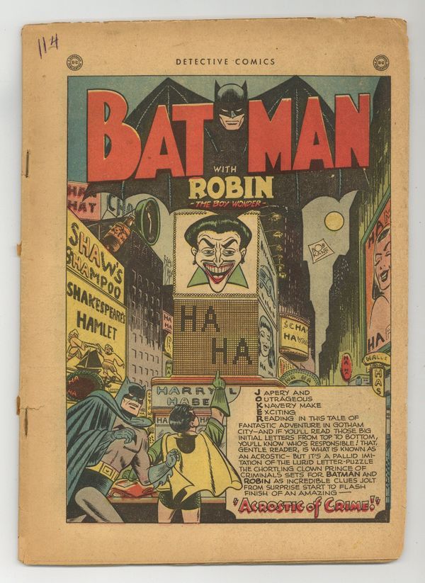 Cover by Win Mortimer. Stories by Don C. Cameron and unknown. Art by Win Mortimer, John Daly, Lee Harris, Curt Swan and Steve Brodie. 1st small logo. Not being in the headlines for weeks rankles the Joker, so the Crime Clown decides to challenge Batman and Robin to a "Crime Acrostic" Contest in "Acrostic of Crime!" by Don C. Cameron and Win Mortimer. Plus: Slam Bradley in "Something in the Air!" with art by John Daly; Air Wave in "The Night Owls' Musicale!" with art by Lee Harris; and The Boy Commandos in "Journey into Nowhere" with art by Curt Swan and Steve Brodie. Also: Shorty 2-pager; Jasper half-pager by Lit-Win; 2-page text story "The Lethal Light" by V.V. Dredaine; and Daffy & Doodle 1-pager by Lit-Win. 52 pages, full color. Cover price $0.10.