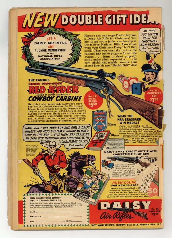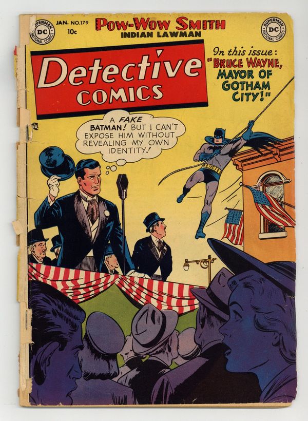 Cover by Win Mortimer. Stories by David Vern and unknown. Art by Dick Sprang, Charles Paris, Leonard Starr, Frank Bolle and Ruben Moreira. Racketeer Deuce Chalmers has figured out that Bruce Wayne is Batman...the trouble is, how does he prove it? And Bruce has troubles as well with his secret identity since he has been appointed temporary Mayor of Gotham City! Don't miss Batman and Robin in "Mayor Bruce Wayne!" by David Vern, Dick Sprang and Charles Paris. Plus: Pow-Wow Smith, Indian Lawman in "The Reforming of Little Elk" with art by Leonard Starr; Robotman in "Robotman Crusoe" with art by Frank Bolle; and Impossible -- But True! tale "The Luckiest Man on Earth!" (featuring Roy Raymond) with art by Ruben Moreira. Also: Quick Quiz activity page by H.T. Elmo; 1-page text piece "Frontier Photographer"; Casey the Cop half-pager by Henry Boltinoff; Shorty half-pager by Boltinoff; and 1-page text story "Missouri Marathon." 44 pages, full color. Cover price $0.10.