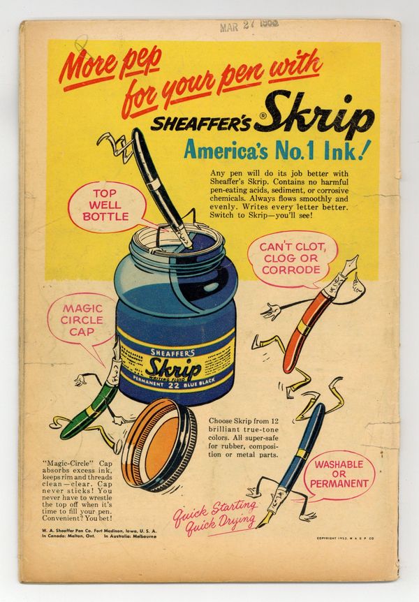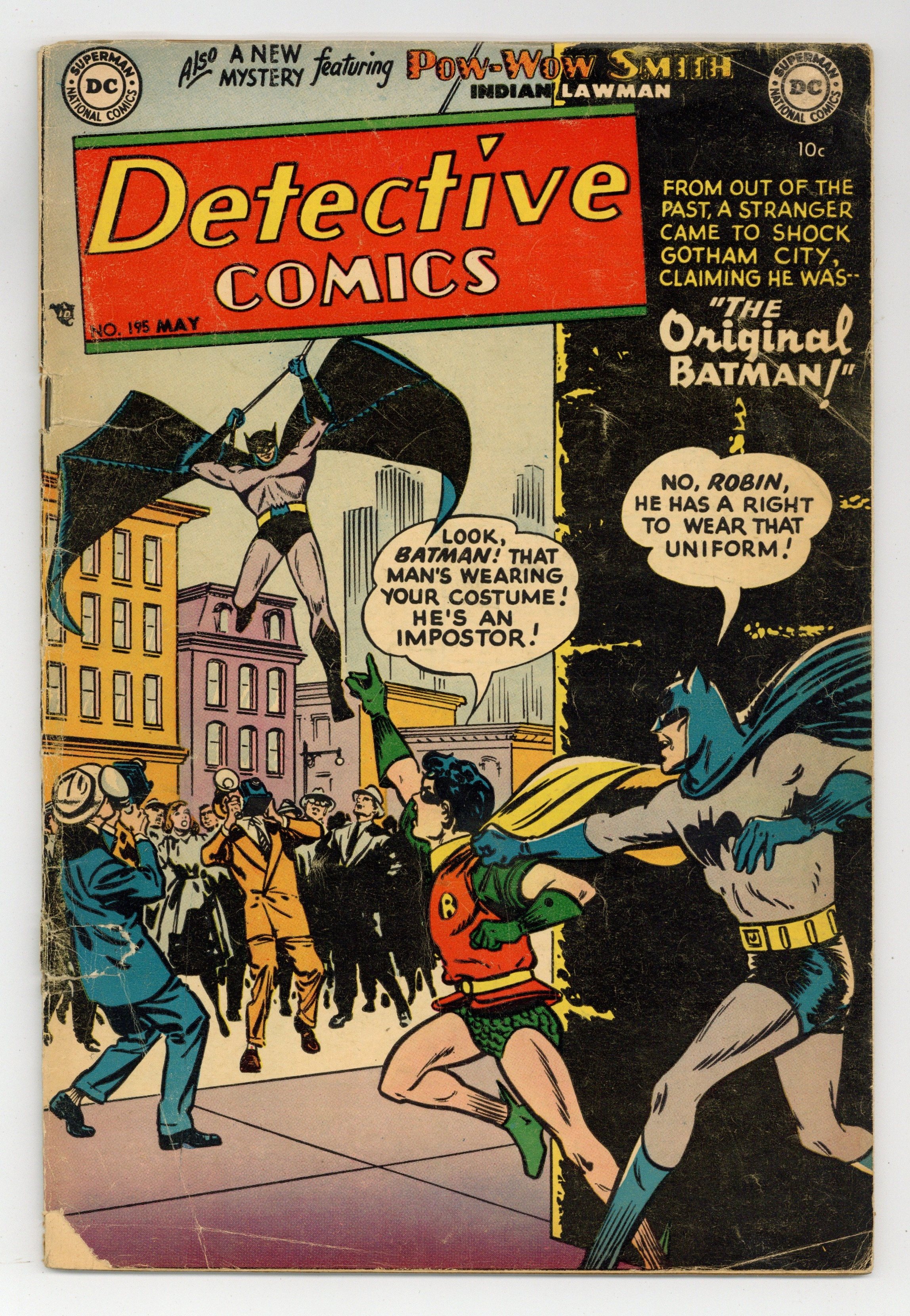 Cover by Win Mortimer. Stories by unknown. Art by Dick Sprang, Charles Paris, Leonard Starr, Joe Certa and Ruben Moreira. From out of the past, a stranger came to shock Gotham City, claiming he was..."The Original Batman" with art by Dick Sprang and Charles Paris. Plus: Pow-Wow Smith, Indian Lawman in "The Ghost Riders of Weeping Valley" with art by Leonard Starr; Robotman in "Robotman-Guided Missle" with art by Joe Certa; and Impossible -- But True! tale "The Magic Wand" (featuring Roy Raymond) with art by Ruben Moreira. Also: Quick Quiz activity half-pager by H.T. Elmo; Casey the Cop 1-pager by Henry Boltinoff; Varsity Vic 1-pager by Boltinoff; and 2-page text piece "The Precinct" by Jack Miller. 44 pages, full color. Cover price $0.10.