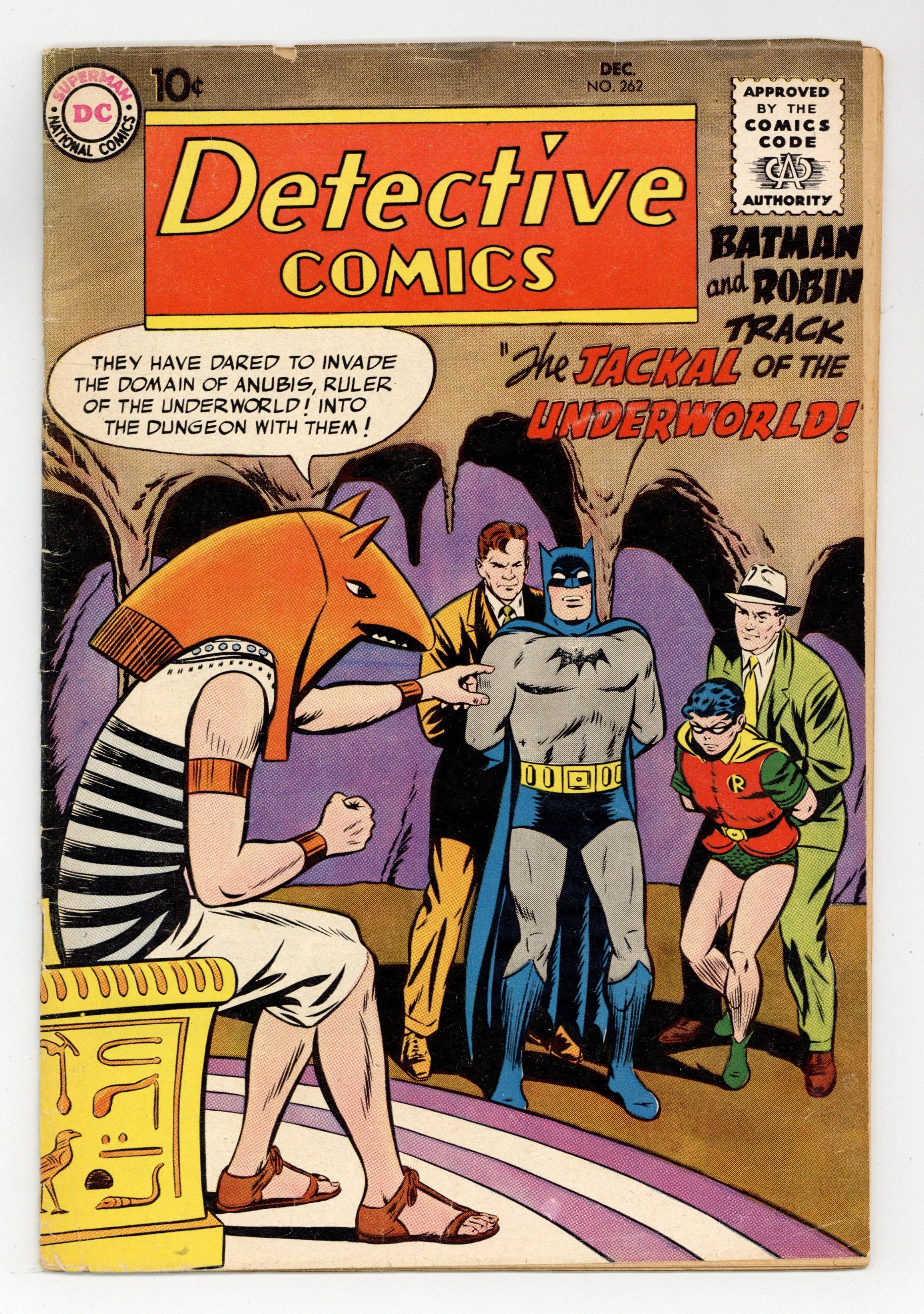 Cover pencils by Curt Swan, inks by Stan Kaye. "Origin of the Jackal in The Jackal of the Underworld!" starring Batman and Robin, pencils by Sheldon Moldoff, inks by Charles Paris; An archeologist appears to be driven mad by the mask he has discovered; vs. Jackal-Head (Gibson) introduction. Warden Willis humor page by Henry Boltinoff. "The Man With the X-Ray Eyes!: starring Roy Raymond TV Detective, art by Ruben Moreira; Roy vs. Mr. Kliff. Sharing—The United Nations Way! public service announcement, script by Jack Schiff, art by George Roussos. Batman Whirly-Word Game by Martin Naydel. "The Animal Crime Kingdom" starring John Jones Manhunter from Mars and Captain Harding, art by Joe Certa; An unnamed gang leader uses animals to commit crimes. 36 pgs., full color. Cover price $0.10.