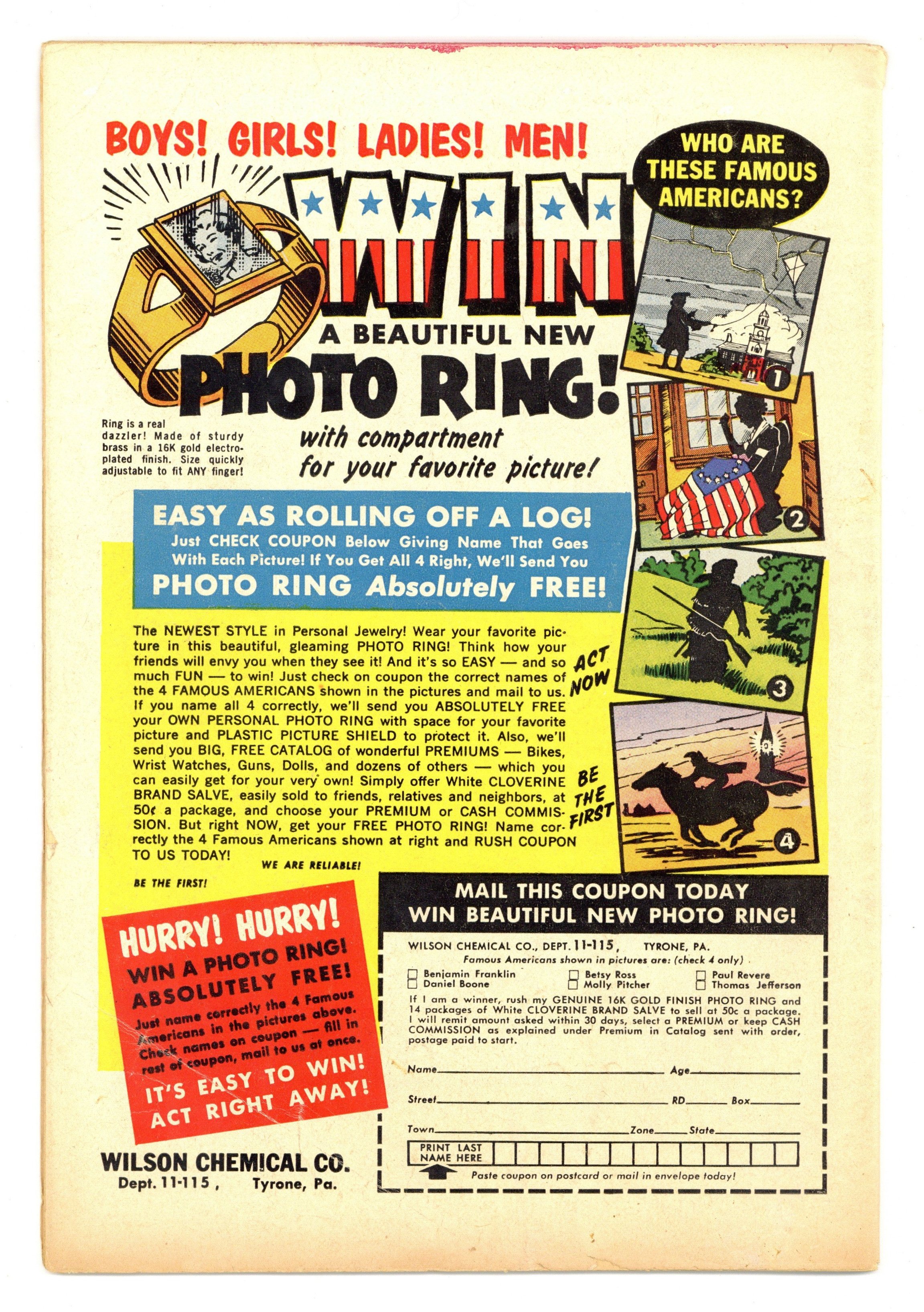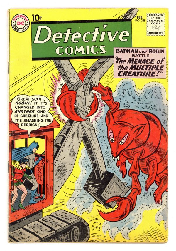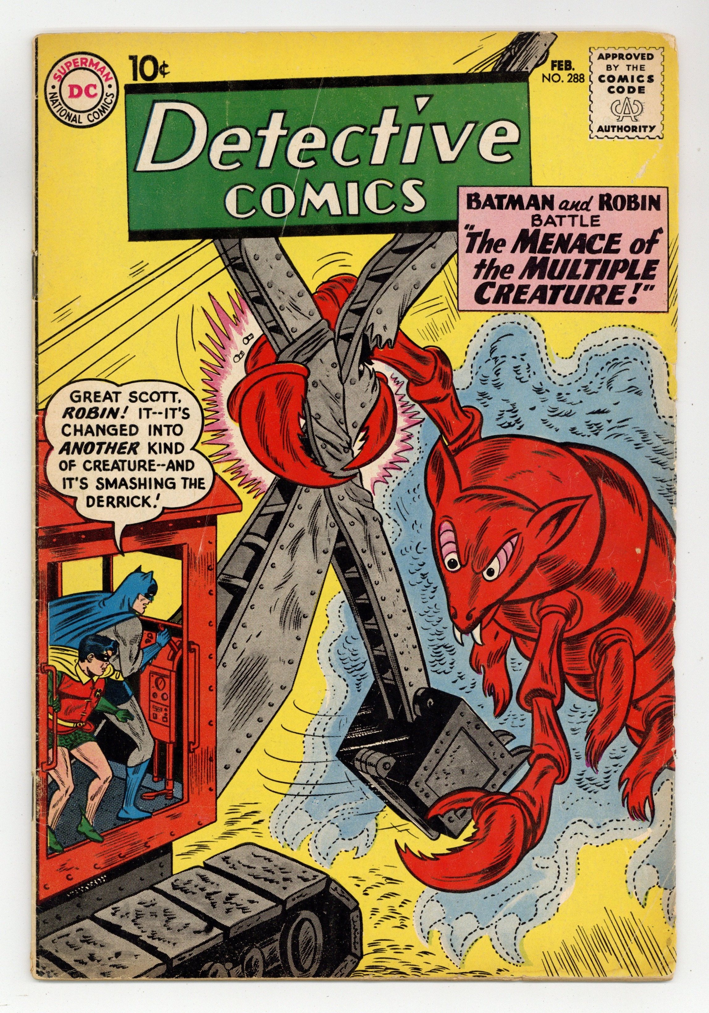 Cover art by Sheldon Moldoff. "The Menace of the Multiple Creature" starring Batman and Robin, pencils by Sheldon Moldoff, inks by Charles Paris; When lightning hits a pool of chemical waste, a strange creature is created which constantly changes shape and size. Our American Heritage public service announcement, script by Jack Schiff, art by Bernard Baily. "The Girl With the Deadly Gaze" starring Roy Raymond TV Detective, art by Ruben Moreira; Roy investigates Janie Vance, who thinks she has the curse of Medusa. Jail Jests humor page by Henry Boltinoff. "Doom Rings the Doorbell" text story. "Case of the Honest Swindler" starring John Jones Manhunter from Mars, art by Joe Certa; Larry Loder is conned by Jed Peters into using three fake magical gadgets; The Martian Manhunter uses his powers to make the fake gadgets appear to really work. Statement of ownership; Average number of copies per issue, previous year: 314,000. 36 pgs., full color. Cover price $0.10.