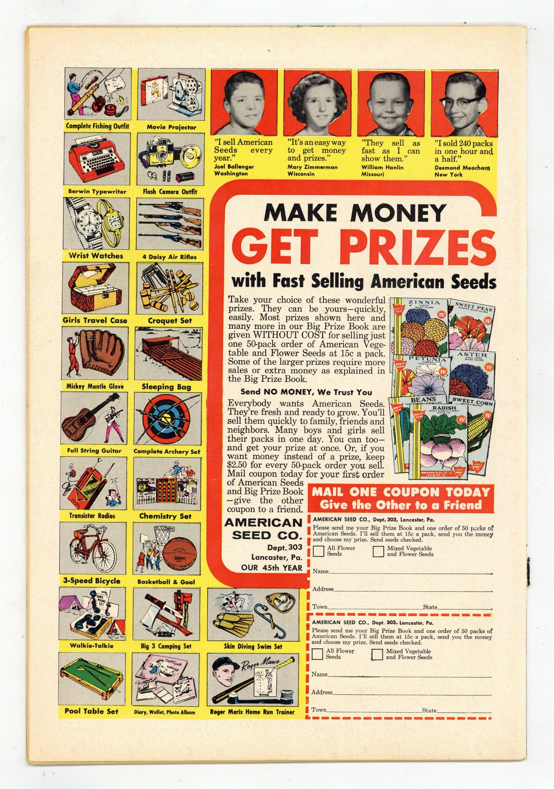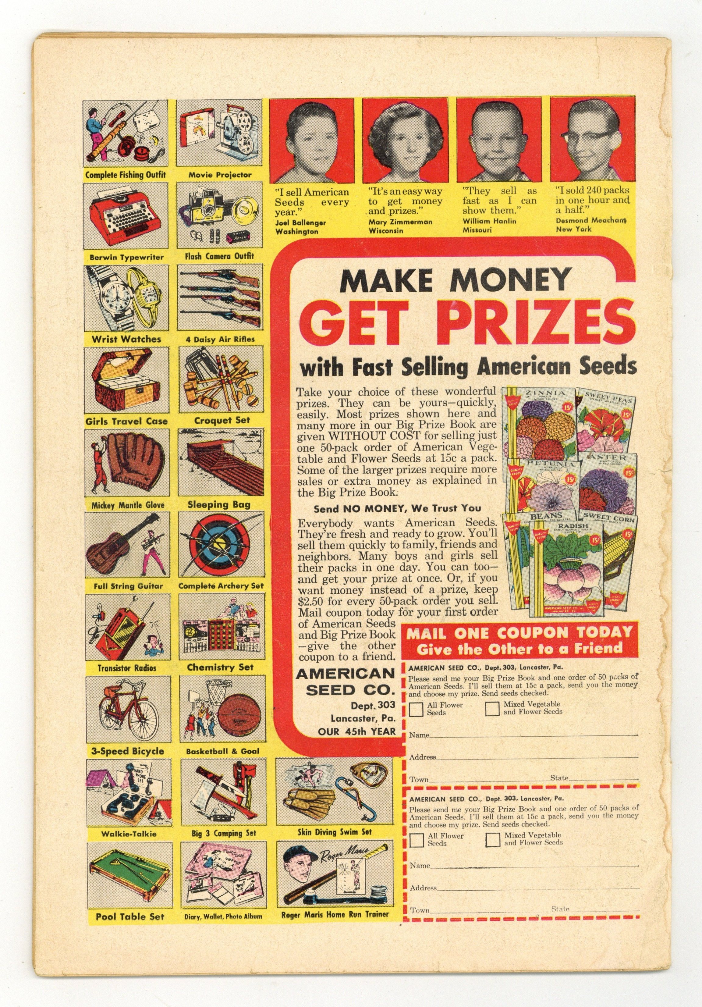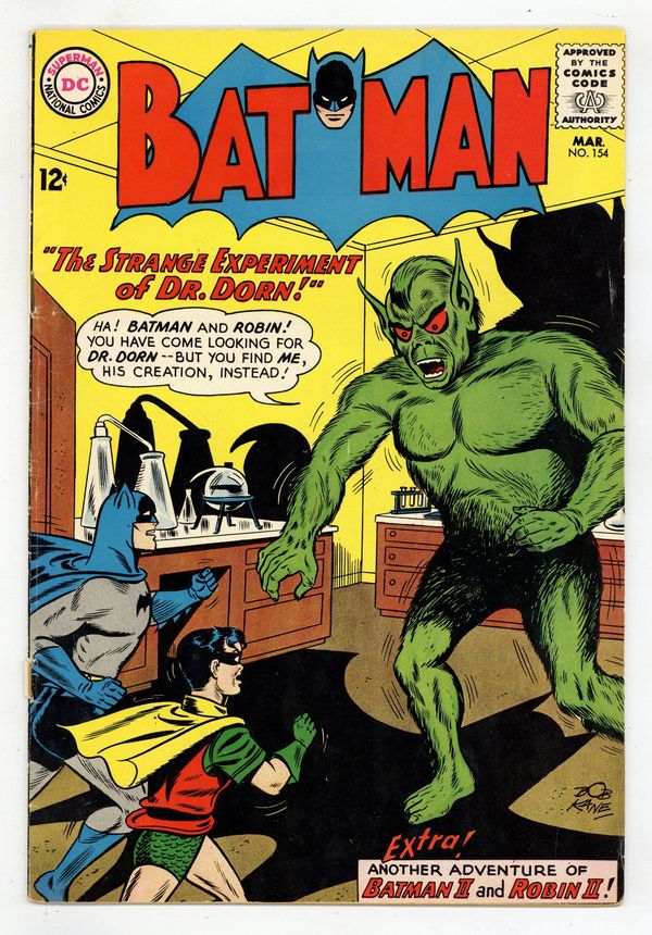 Cover pencils by Bob Kane, inks by Charles Paris. "Danger Strikes Four," script by Bill Finger, pencils by Sheldon Moldoff, inks by Charles Paris; As Dick begins reading Alfred's latest imaginary tale of Batman II and Robin II, he is called upon by the Caped Crusader to battle Big Al and his men, with all involved in circumstances strangely resembling Alfred's story. "The Amazing Odyssey of Batman and Robin," script by Bill Finger, pencils by Sheldon Moldoff, inks by Charles Paris; When the remains of the Bat-Boat are found, its log is sent to Commissioner Gordon, who announces that Batman is dead, leaving a stage magician free to commit his crimes! Safety First -- All Year! public service announcement, script by Jack Schiff, art by Sheldon Moldoff; Johnny discovers the hazards of leaving things lying around the home. "The Strange Experiment of Doctor Dorn," script by Bill Finger, pencils by Sheldon Moldoff, inks by Charles Paris; A large green creature is menacing Gotham City, so the Dynamic Duo are called in to assist, and they discover a way to get the creature to pass away, leaving Dr. Dorn free without any effect. 36 Pages, Full Color. Cover price $0.12.