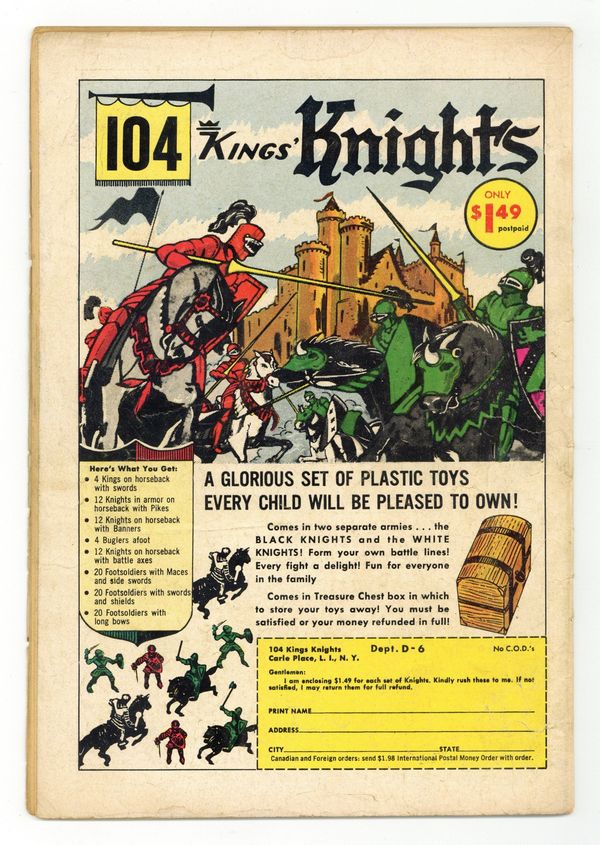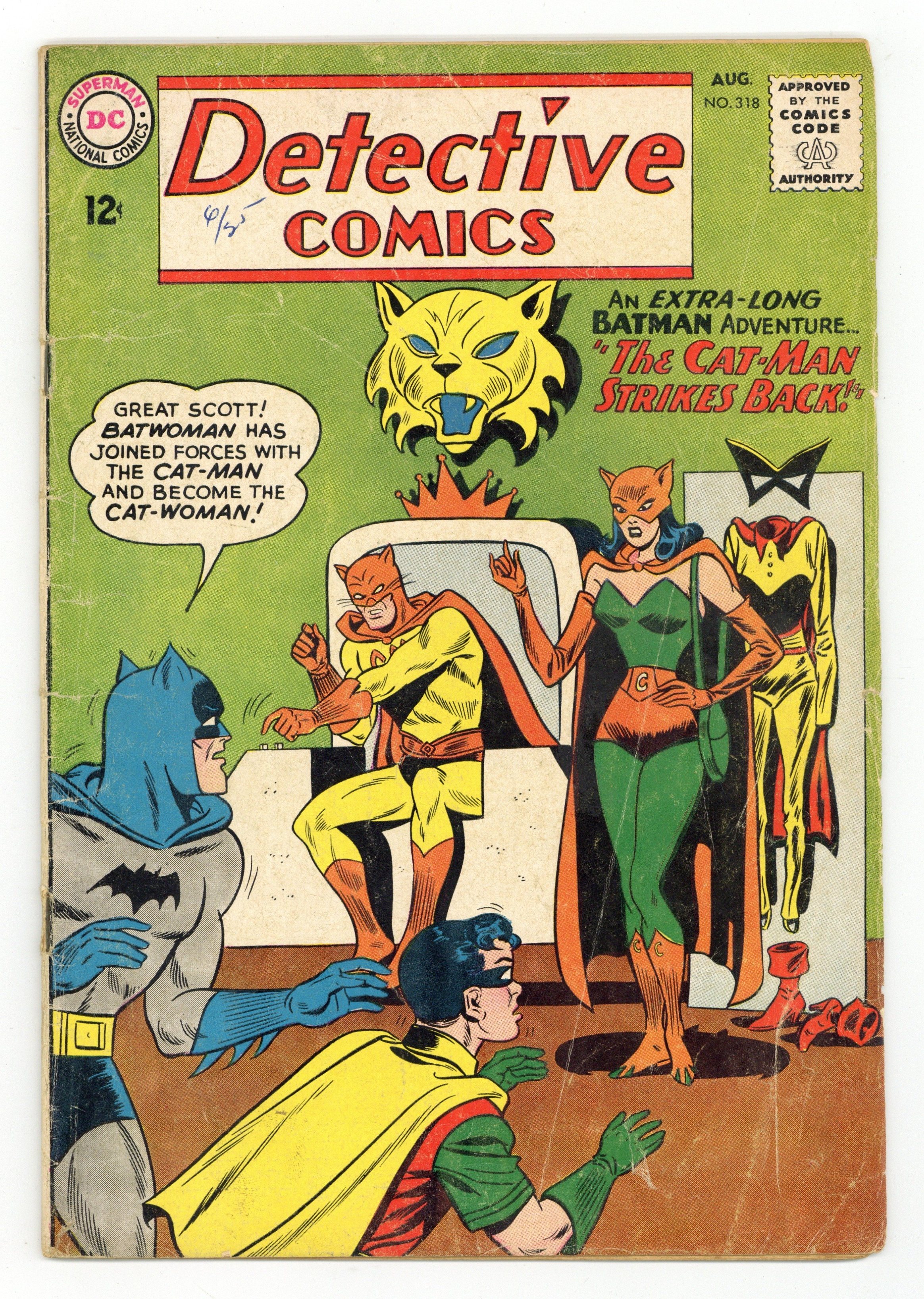 Cover art by Dick Dillin and Sheldon Moldoff. "The Cat-Man Strikes Back" starring Batman, Robin, and Ace the Bat-Hound, pencils by Jim Mooney, inks by Jim Mooney , Sheldon Moldoff, and Mike Esposito; The Cat-Man returns to bedevil Gotham City, Batman and Robin with new crimes, based on famous fictional cats; After his first crime, Cat-Man saves Batwoman's life and tells her he'd like to have her as her partner, before leaving the crime scene; During Cat-Man's second crime, Batwoman makes a mistake that causes Batman and Robin to be unable to capture Cat-Man; Batman thinks that Batwoman did that on purpose to repay the criminal for saving her life and Batwoman decides to leave Batman and join Cat-Man. True Crime Laffs humor page by Henry Boltinoff. How Not to Enjoy a Vacation! public service announcement, script by Jack Schiff, art by Ruben Moreira. The Fantastic Forgers!' article. "J'onn J'onzz's Enemy—Zook" starring John Jones Manhunter from Mars, story and art by Joe Certa; Zook gets amnesia and falls into the hands of criminals. 36 pgs., full color. Cover price $0.12.