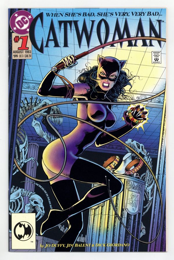 Tags: Embossed Cover$22.00Bane's in charge and Catwoman's stealing on his behalf in "Life Lines Chapter 1: Rough Diamonds!" Part 1 of 4, continued next issue. Script by Jo Duffy, pencils by Jim Balent, inks by Dick Giordano. Balent embossed cover. Cover price $1.95.