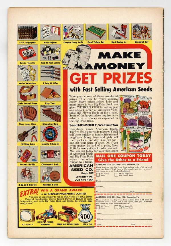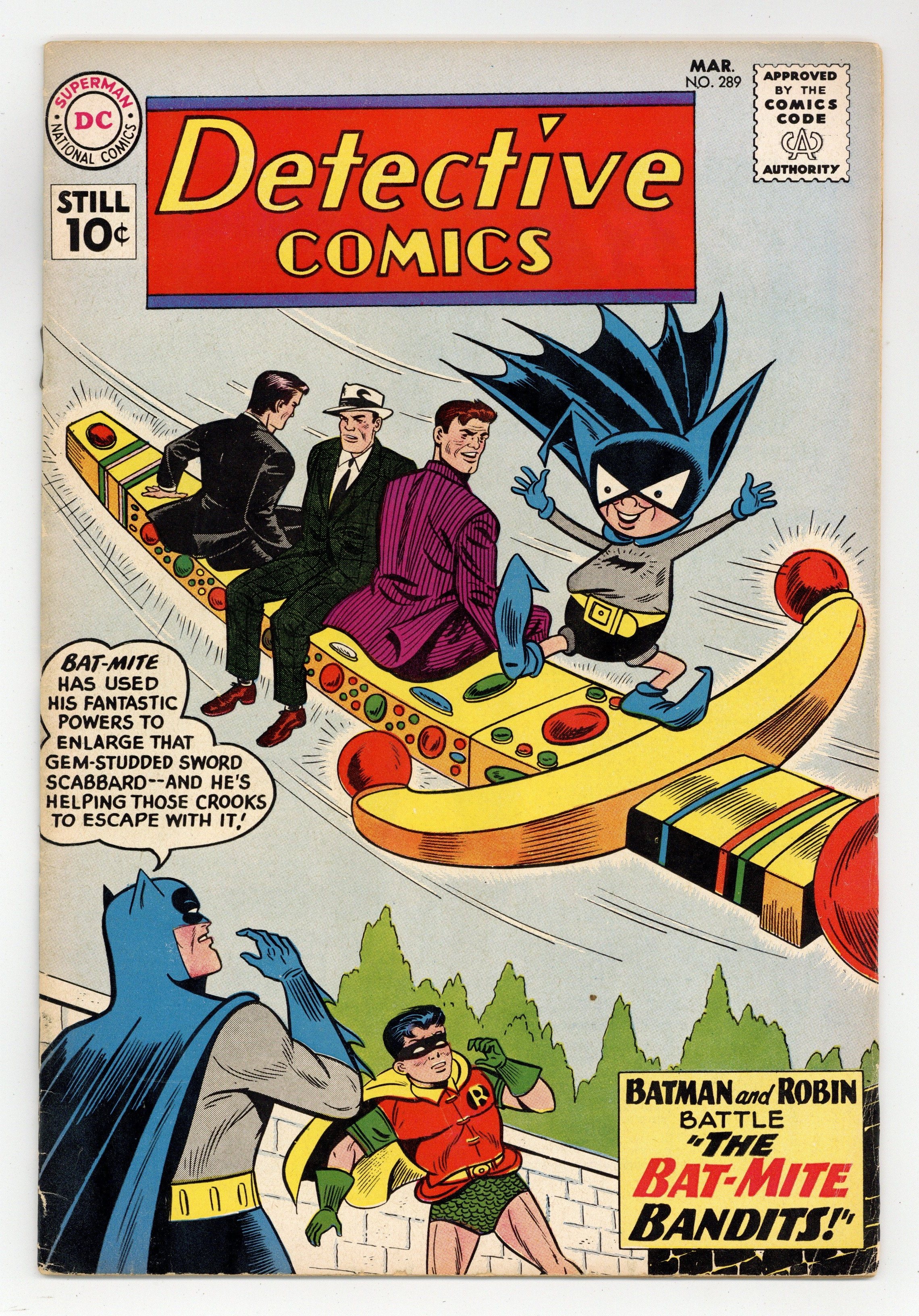 Tags: Batman$80.00Cover art by Sheldon Moldoff. "The Bat-Mite Bandits" starring Batman and Robin, pencils by Sheldon Moldoff, inks by Charles Paris; Bat-Mite returns to Earth and is tricked by a crook into helping his gang commit crimes, thinking he is helping to make movies of Batman and Robin in action; When Bat-Mite finally learns the truth, he uses his extraordinary powers to help Batman and Robin capture the criminals he had helped and the leader of the gang, who was responsible for tricking him in the first place. Don't Sell Nature Short! public service announcement, script by Jack Schiff, art by Bernard Baily. Warden Willis humor half-page story by Henry Boltinoff. "The Deadly Designs From Space" starring Roy Raymond TV Detective, art by Ruben Moreira; Roy vs. Big Mike Manson and Mr. Wagner. "J'onn J'onzz--Witch Doctor" starring John Jones Manhunter from Mars, art by Joe Certa; Jones goes to Asia to try to capture a Gang Boss; The Martian Manhunter has to disguise himself as a witch doctor to infiltrate the tribe where Moss is hiding. 36 pgs., full color. Cover price $0.10.