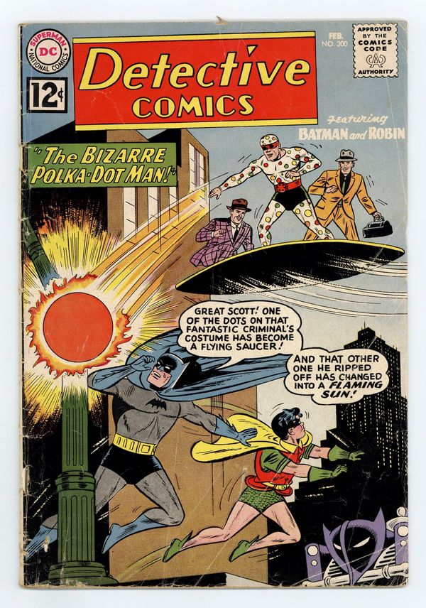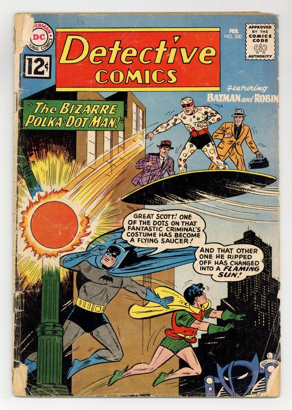 Tags: Print Run Statistics, Batman$140.00Cover art by Sheldon Moldoff. "The Bizarre Polka-Dot Man" starring Batman and Robin, pencils by Sheldon Moldoff, inks by Charles Paris; Batman and Robin confront a new costumed criminal in Gotham under the alias of Mr. Polka Dot who has started a crime wave based on spots and dots; To conceal his identity, Polka Dot wore a bizarre costume covered in spots, the point of which soon became apparent - once removed from the costume, the spots could be used for a variety of purposes, creating deadly weapons and a bizarre escape vehicles; Perhaps surprisingly, he succeeded in capturing Robin, but Batman was nonetheless able to save his crime fighting partner and bring Krill's crime spree to an end. . Lefty Looie humor page by Henry Boltinoff. Let Science Serve You! public service announcement. "The J'onn J'onzz Museum" starring John Jones Manhunter from Mars, art by Joe Certa; Criminals use newsreel footage of J'Onzz to determine his weakness. Danger: Police at Work article. "The Mystery Of The Undersea Safari," art by Nick Cardy (Aquaman series ends); Aquaman and Aqualad help Professor Peters stop some crooks from stealing a pirate treasure. Statement of ownership--average paid circulation, 325,000. 36 pgs., full color. Cover price $0.12.