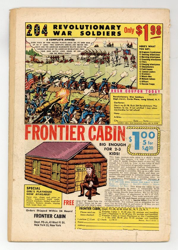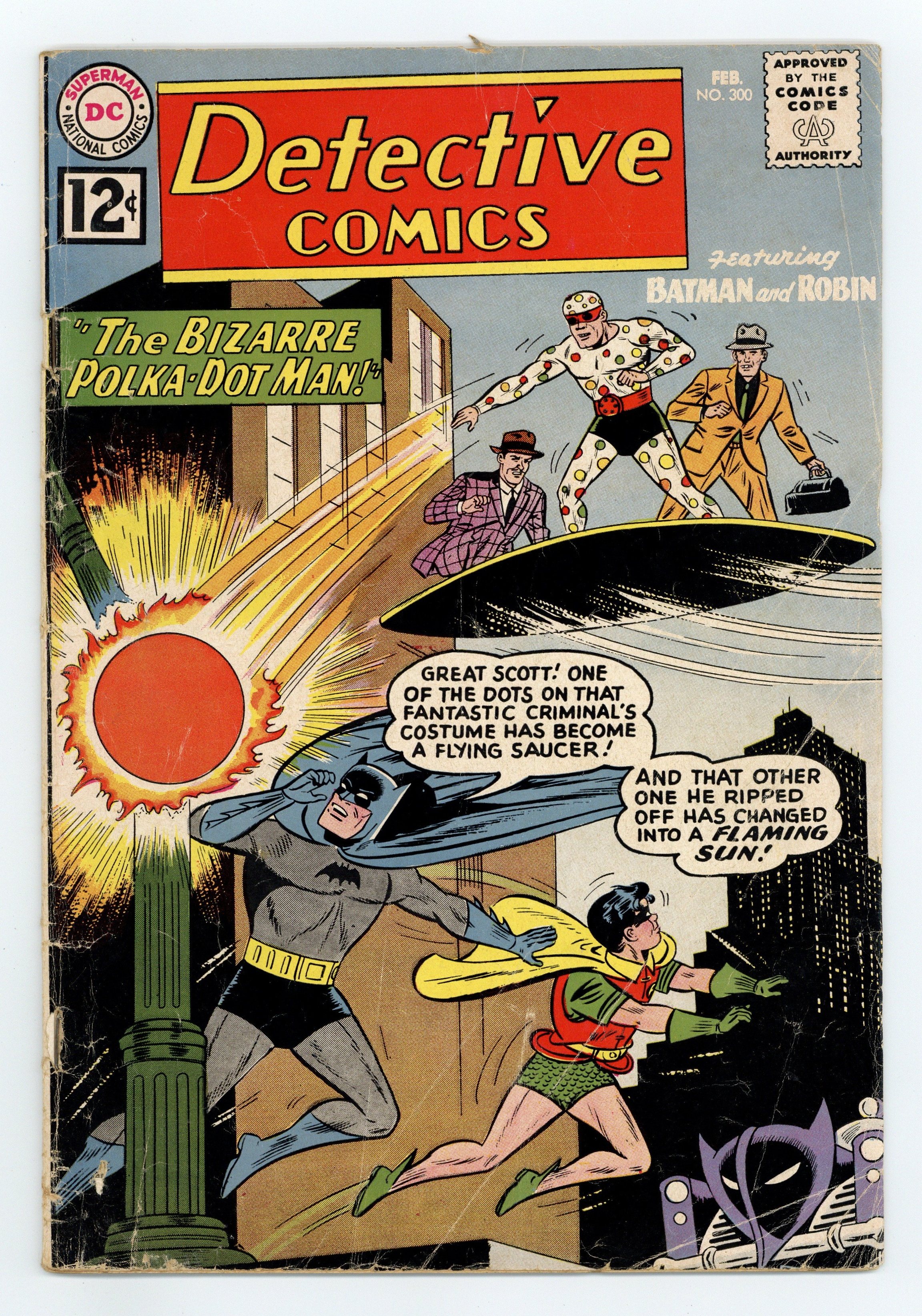 Cover art by Sheldon Moldoff. "The Bizarre Polka-Dot Man" starring Batman and Robin, pencils by Sheldon Moldoff, inks by Charles Paris; Batman and Robin confront a new costumed criminal in Gotham under the alias of Mr. Polka Dot who has started a crime wave based on spots and dots; To conceal his identity, Polka Dot wore a bizarre costume covered in spots, the point of which soon became apparent - once removed from the costume, the spots could be used for a variety of purposes, creating deadly weapons and a bizarre escape vehicles; Perhaps surprisingly, he succeeded in capturing Robin, but Batman was nonetheless able to save his crime fighting partner and bring Krill's crime spree to an end. . Lefty Looie humor page by Henry Boltinoff. Let Science Serve You! public service announcement. "The J'onn J'onzz Museum" starring John Jones Manhunter from Mars, art by Joe Certa; Criminals use newsreel footage of J'Onzz to determine his weakness. Danger: Police at Work article. "The Mystery Of The Undersea Safari," art by Nick Cardy (Aquaman series ends); Aquaman and Aqualad help Professor Peters stop some crooks from stealing a pirate treasure. Statement of ownership--average paid circulation, 325,000. 36 pgs., full color. Cover price $0.12.