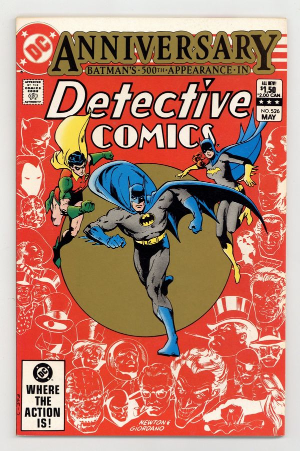 Tags: Giant-Sized Issue, Batman$20.50Direct Edition. This special 68-page square-bound giant edition commemorates Batman's 500th appearance in Detective Comics. The lead story for this issue, "All My Enemies Against Me!" kicks off with an impressive two-page splash featuring a rogue's gallery of Batman's greatest foes--17 of Gotham's worst villains. The Joker isn't depicted only because he arrives late to the council of criminals. It's one wild, book-length saga as Batman, Robin and Batgirl mix it up with the 17, plus the Joker, Catwoman and Killer Crock. This enjoyable story is written by Gerry Conway with impressive art by Don Newton and skilled inking from Alfredo Alcala. 68 pgs. Cover price $1.50.