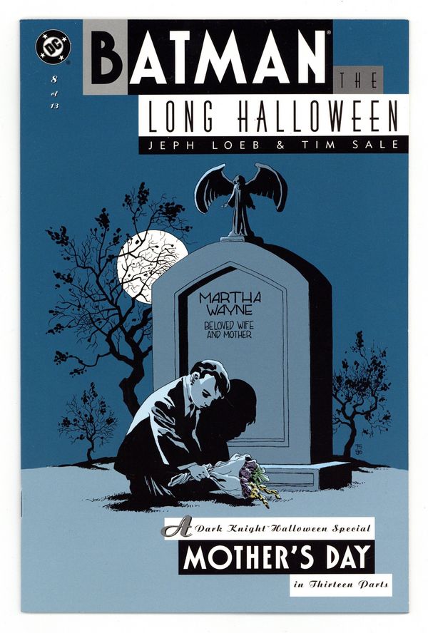 Tags: Batman$23.00"Mother's Day." The Scarecrow escapes from Arkham Asylum and douses Batman with fear gas. Bruce, under the influence, runs from Captain Gordon. The death of Bruce Wayne's parents is revisited, further illuminating Batman's motivations for fighting crime. A contest for readers to guess the identity of Holiday is announced. Script by Jeph Loeb, art and cover by Tim Sale. Cover price $2.95.