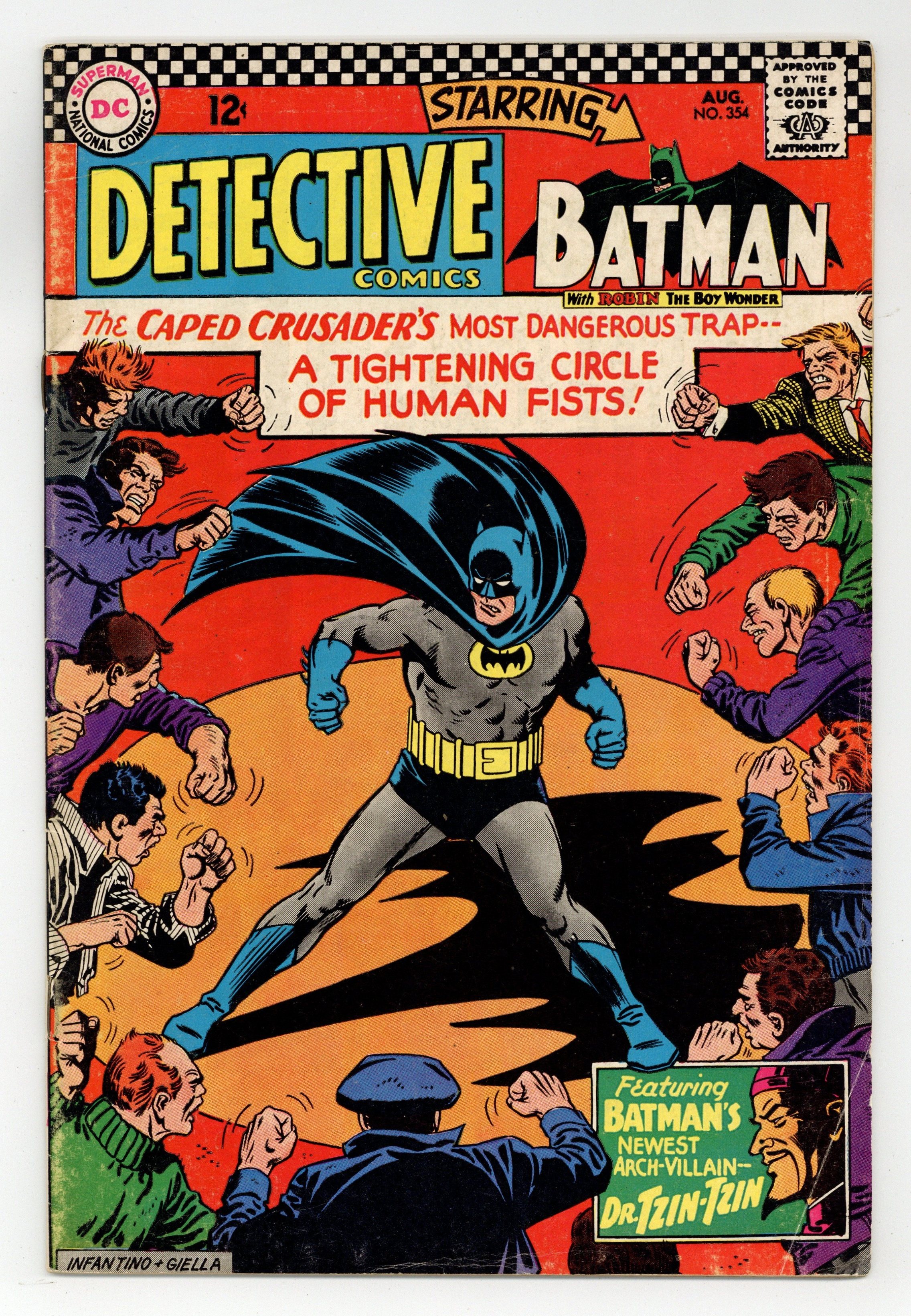 Written by John Broome. Art by Sheldon Moldoff and Joe Giella. Cover by Carmine Infantino and Joe Giella. No Exit for Batman!; Batman discovers that the evil Dr. Tzin-Tzin is in Gotham City; he then uses Tzin-Tzins communicator to locate him. Written by John Broome. Art by Carmine Infantino. The Double-Dealing Jewel Thieves!; Ralph Elongated Man Dibny visits a museum of replicas of famous treasures. Letter to the editor from comics writer Mike Friedrich. Stetement of ownership--average print run 485,000; average paid circulation 304,414. 36 pages, full color. $0.12. Cover price $0.12.
