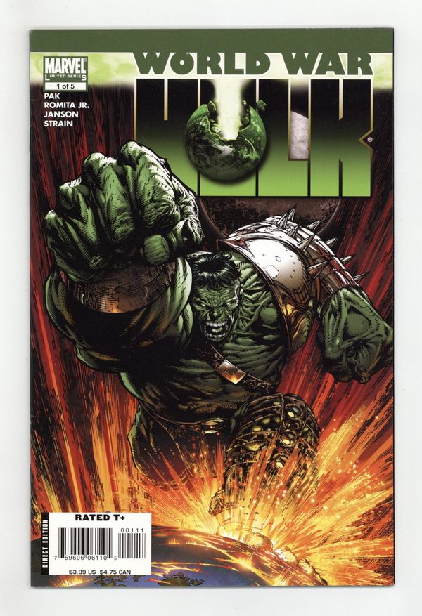 Tags: World War Hulk (part 2)$24.00Written by GREG PAK Penciled by JOHN ROMITA JR. Cover by DAVID FINCH Variant Cover by JOHN ROMITA JR. Marvel's massive summer smashfest begins! Exiled by a group of Marvel 'heroes' to the savage alien planet of Sakaar, the Hulk raged, bled and conquered through the pages of last year's 'Planet Hulk' epic, rising from slave to gladiator to king. Now the Hulk returns to Earth to wreak his terrible vengeance on Iron Man, Reed Richards, Dr. Strange and Black Bolt -- and anyone else who gets in his way. Stronger than ever, accompanied by his monstrous Warbound gladiator allies, and possessed by the fiercest and purest rage imaginable, the Hulk may just tear this stupid planet in half. The epic story of anger unbound begins with this special double-sized issue written by 'Planet Hulk' scribe Greg Pak and penciled by the legendary John Romita, Jr. 48 PGS./Rated T+ Cover price $3.99.