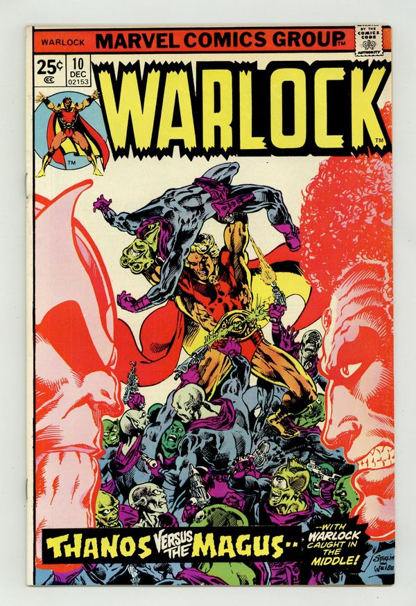 Cover pencils by Jim Starlin, inks by Alan Weiss. "How Strange My Destiny!" (part 1), script and pencils by Jim Starlin, inks by Steve Leialoha; Thanos helps Adam Warlock and Gamora to defeat Magus's army; Thanos tries to convince Warlock that the only way to stop Magus is to kill himself; Guest starring Pip the Troll; First appearance of the In-Betweener; Captain Marvel appearance; Cameos by Eros, the Vision, the Scarlet Witch, Captain America, Drax the Destroyer, Thor, the Swordsman, the Black Panther, the Magus, Thanos, and the Cosmic Cube. 36 pgs., full color. $0.25. Cover price $0.25.
