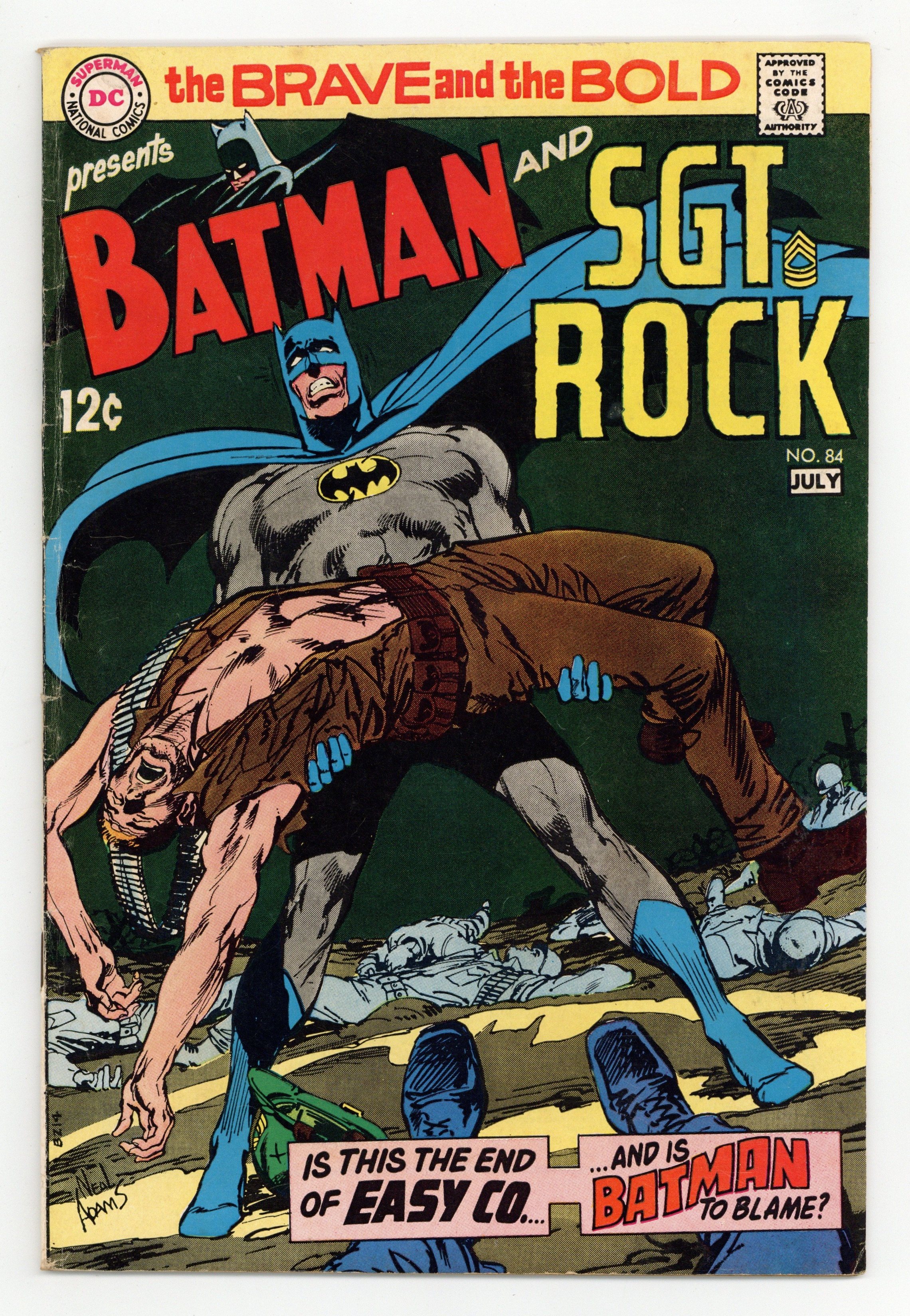 Last 12-cent cover price. Cover by Neal Adams. "The Angel, the Rock and the Cowl," script by Bob Haney, pencils by Neal Adams, inks by Neal Adams and Joe Kubert (page 19); When Bruce Wayne is called to the Gotham Museum to see the statue of the Archangel Gabriel smuggled out of Nazi-occupied France during World War II, because a man with a German accent called about it called to claim it; Bruce informs him that the real statue is still in France and the one in Gotham is a fake; They are then attacked by a man Bruce recognizes as Von Stauffen; Bruce then recalls back to a day during World War II, when he was in London, and his friend, a British spy named Digby is killed in a bombing and so Bruce covered his mission for the British forces; Traveling into Nazi occupied France, Bruce meets up with Sgt. Rock and Easy Company along the way; Investigating a strange amount of wine coming out of Chateaurouge, Bruce learns that it's occupied by Nazi's led by Von Stauffen; As a spy, Bruce is unable to learn what the secret is behind the wine, so he tries as Batman and comes to blows with Rock and Easy Company again who happen to be in the area. 36 Pages, Full Color. Cover price $0.12.