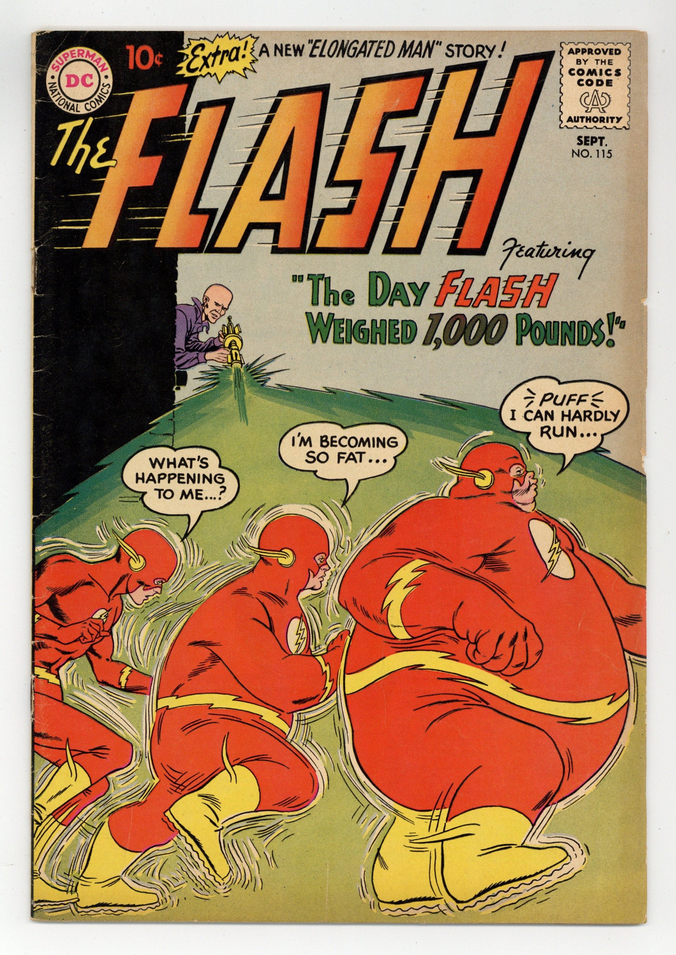 Cover pencils by Carmine Infantino, inks by Joe Giella. The Day Flash Weighed 1,000 Pounds!, script by John Broome, pencils by Carmine Infantino, inks by Joe Giella; Gorilla Grodd, disguised as William Dawson, uses a special gun that causes Flash to gain 1,000 pounds. The Elongated Man's Secret Weapon!, script by John Broome, pencils by Carmine Infantino, inks by Murphy Anderson; Ralph the Elongated Man Dibny travels to the Yucatan to see the Gingo tree that gives him his ability to stretch; Flash and Ralph are reduced in size. Ad for Giant Superman Annual. Jack Rabbit Hop! fact half-page. 36 Pages, Full Color. Cover price $0.10.