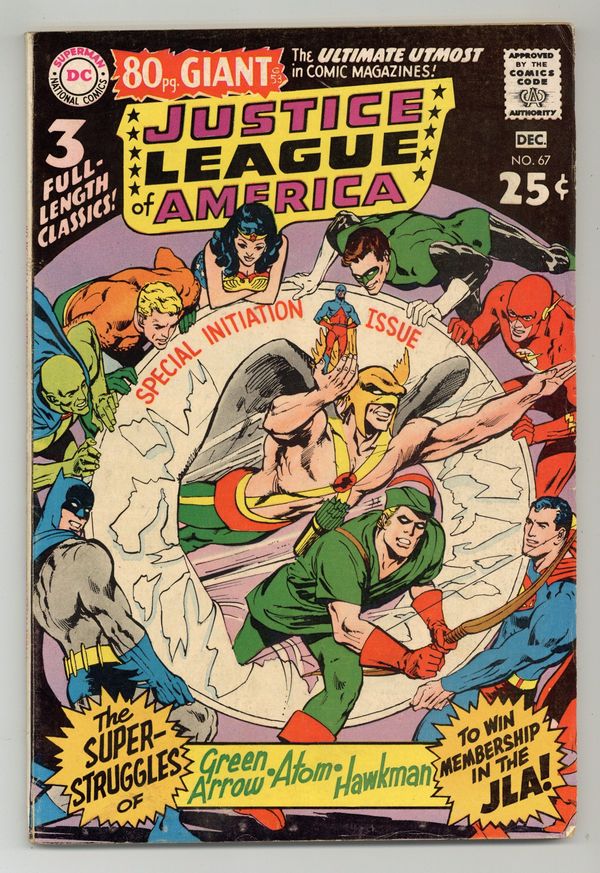 $20.50Cover art by Neal Adams. Doom of the Star Diamond, script by Gardner Fox, pencils by Mike Sekowsky, inks by Bernard Sachs; Carthan, banished from his homeworld Dryanna to Earth by his ruler Xandor, attempts to contact the Justice League for help but cannot do so directly; He activates three machines of destruction that hold him to Earth and takes Green Arrow hostage, hoping that the Justice League can deactivate the machines and free him. The Menace of the 'Atom' Bomb!, script by Gardner Fox, pencils by Mike Sekowsky, inks by Bernard Sachs. Riddle of the Runaway Room!, script by Gardner Fox, art by Mike Sekowsky. This issue reprinths the following JLA issues: JLA 4, 14, 31. 84 pgs. $0.25. Cover price $0.25.