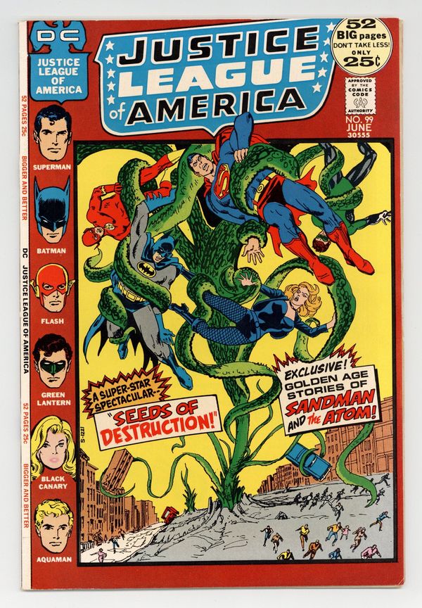 Cover art by Nick Cardy. Seeds of Destruction! starring the Justice League, Bur Sed, and Ker Sed, script by Mike Friedrich, pencils by Dick Dillin, inks by Joe Giella. Case of the Stolen Emeralds starring Sandman [Wesley Dodds], Dian Belmont, and Flip Benson, script by Gardner Fox, art by Chad Grothkopf. Terror Rides the Rails! starring the Atom (Al Pratt), pencils by Carmine Infantino, inks by Frank Giacoia. 52 pgs. $0.25. Cover price $0.25.