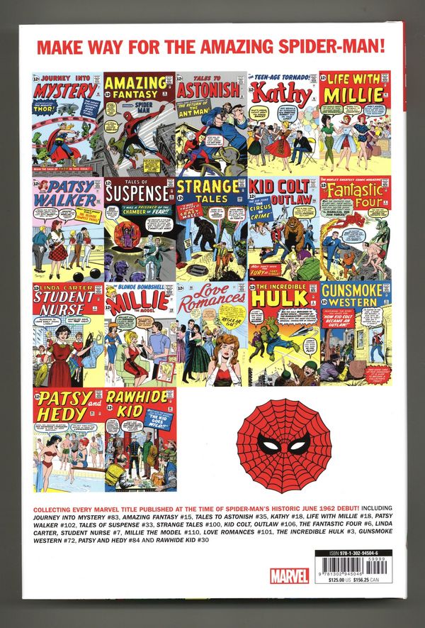 1st printing. Collects Thor (1962-1996 Marvel 1st Series Journey Into Mystery) #83; Amazing Fantasy (1962) #15; Tales to Astonish (1959-1968 1st Series) #35; Kathy (1959-1964 2nd Series) #18; Life with Millie (1960-1962) #18; Patsy Walker (1945-1965) #102; Kid Colt Outlaw (1948-1979) #106; Fantastic Four (1961-1996 1st Series) #6; Linda Carter, Student Nurse (1961-1963) #7; Millie the Model (1946-1973) #110; Strange Tales (1951-1976 1st Series) #100; Tales of Suspense (1959-1968) #33; Love Romances (1949-1963) #101;The Incredible Hulk (1962-1999 Marvel 1st Series) #3; Gunsmoke Western (1955-1963 Marvel/Atlas) #72; Patsy and Hedy (1952-1967) #84 and Rawhide Kid (1955-1979) #30.
