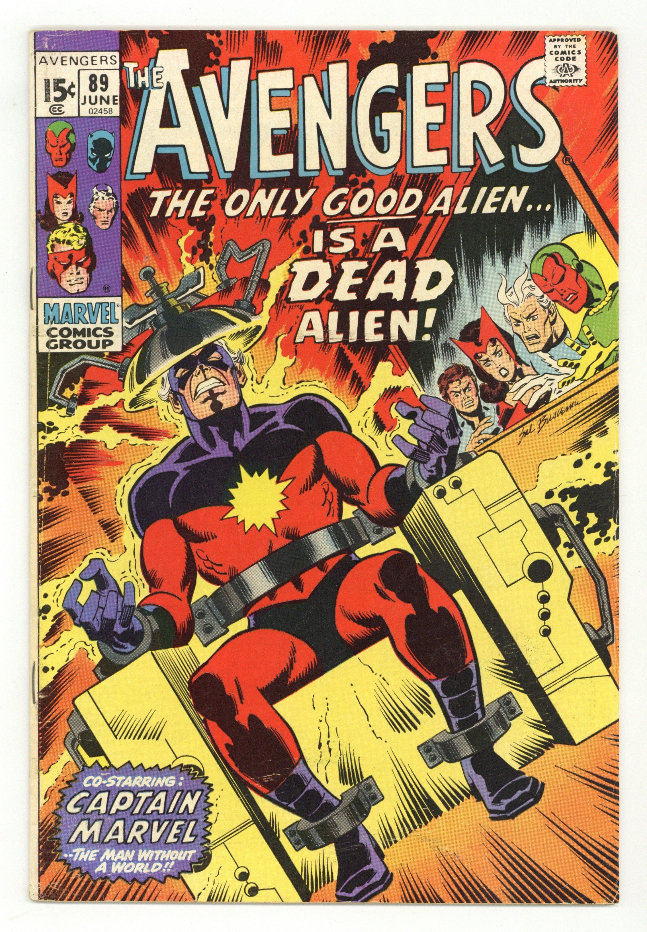 "The Only Good Alien... " Part 1 of 9. Guest-starring Captain Marvel. Script by Roy Thomas. Pencils by Sal Buscema. Inks by Sam Grainger. Cover by Sal Buscema. The classic Kree/Skrull War storyline starts with a bang as Earth's Mightiest Heroes and Rick Jones pursue Captain Marvel on the streets of Miami! Wow, why are the Avengers chasing the Kree Warrior? Especially after Wanda, Pietro, and the Vision just fought alongside him several hours ago in the Baxter Building vs. Annihilus! Dangerously though, the cosmic superhero's body is teeming with deadly radiation after spending too much time in the Negative Zone! Once the Avengers capture Captain Marvel, they take him to Cape Canaveral in hopes of saving his life! Meanwhile on Hala, the Kree homeworld, Ronan the Accuser leads a rebellion against the Supreme Intelligence! Ronan's actions will have immediate and far-reaching effects on the Milky Way Galaxy and of course Earth's Mightiest Heroes! Cameo appearance by Sentry 459. Flashback cameo by Mr. Fantastic to recap his escape from the Negative Zone in Fantastic Four 110. Avengers Lineup: Quicksilver, Scarlet Witch, and the Vision. (Notes: Captain Marvel's participation in the Kree/Skrull War occurs while his own series was on a 2-year hiatus. Ronan previously appeared in Captain Marvel 16. Annihilus appears next in Marvel Team-Up 2. The full Kree/Skrull War saga was reprinted in 2000 in the trade paperback: The Avengers -- The Kree-Skrull War.) 36 pages. Cover price $0.15.