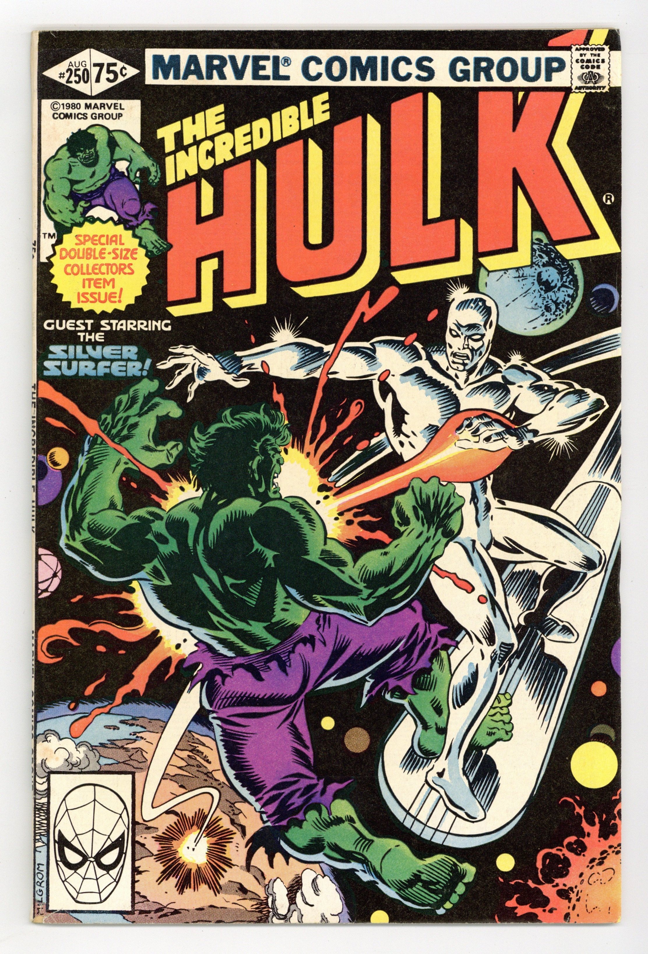 Direct Edition. Special giant-sized issue. Guest-starring Silver Surfer. A 250th celebration brought to you by Bill Mantlo and Sal Buscema. The Earth trembles when titans clash. It's the nigh unstoppable Incredible Hulk vs. the former Herald of Galactus, the Silver Surfer. Imprisoned on Earth by his former master, the Silver Surfer intends to add the immeasurable power of the Hulk to his own and break the barrier that keeps him from his home Zenn-La and his beloved. The only problem is, the Hulk has never been known for his generosity. 52 pages. Cover price $0.75.