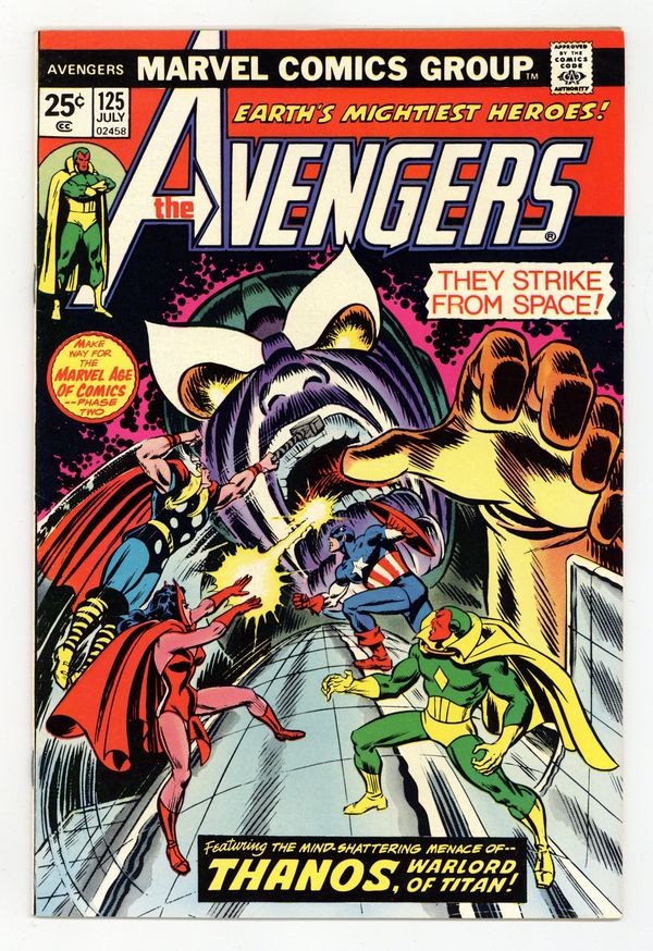 Tags: Marvel Legacy Numbering: Avengers (part 125), Thanos: The Final Threat (part 14), Avengers, Thanos$21.00"The Power of Babel!" Guest-starring Captain Marvel. Script by Steve Englehart. Art by John Buscema (breakdowns) and Dave Cockrum (finishes). Cover by Ron Wilson and John Romita. Story continues from Captain Marvel 32. Captain America returns to the Avengers just in time for an out-of-this-world adventure! Earth's Mightiest Heroes blast off into outer space to intercept Thanos' awesome armada headed towards Earth! The Avengers attack the alien starships and inflict heavy damage until they bump into a solid black force field! What's hiding behind the imposing barrier? The Vision, Scarlet Witch, Swordsman, and Mantis penetrate the force field and discover the mad Titan's massive command ship! And hordes of aliens inside! But these are four mighty avengers! With skill and teamwork, they disable the ship's universal translator and throw the entire attack fleet into chaos! Have the Avengers finally derailed Thanos' plan for conquest of the cosmos? Story concludes in Captain Marvel 33. Cameo appearances by Libra, Lou-Ann, Thanos, and the Skrulls. Avengers Lineup: Black Panther, Captain America, Iron Man, Mantis, Scarlet Witch, Swordsman, Thor, and the Vision. (Note: The letters page contains Marvel Value Stamp Series A #69 Marvel Girl.) 36 pages Cover price $0.25.