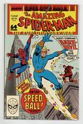 $9.50"Drug War Rages" Guest-starring Daredevil and Speedball. Part 5 of the Evolutionary War storyline. First appearance of Speedball. Plot by Tom DeFalco. Script by David Michelinie. Pencils by Mark Bagley. Inks by Mike Esposito. Cover by Ron Frenz and Joe Rubinstein. What begins as a simple drug bust in a west side warehouse...escalates into a battle atop the Empire State Building to save the lives of everyone in the Big Apple! Along the way the Amazing Spider-Man teams up with a familiar ally, the Man Without Fear; and meets a new superhero: Speedball (aka Robbie Baldwin)! The High Evolutionary wants to sterilize New York's population to eradicate DNA strands deemed to be undesirable! Can the web-slinger, Daredevil, and Speedball defeat the Purifiers and maintain the gene pool status quo? The Evolutionary War storyline continues in Fantastic Four Annual 21. Appearances by the Kingpin, Arranger, Madeline Naylor, Mary Jane Watson, Ben Urich, and J. Jonah Jameson. First backup story: "He Who Laughs..." Plot by Steve Ditko. Script by Roger Stern. Pencils by Steve Ditko. Inks by Jackson Guice. Speedball battles a crazy stagehand seeking revenge against his mother. Second backup story: "Kindred Spirits" Story by Mark Gruenwald. Pencils by Ron Lim. Inks by Tony DeZuniga. Chapter 6 of the High Evolutionary's history. Inside his Wundagore Mountain citadel, Edgar Wyndham creates Bova -- the future nanny of Quicksilver and the Scarlet Witch; and foolishly ignores Magnus' warning that the spirit of Chthon is bound to Wundagore Mountain. First backup feature: Spider-Man and J. Jonah Jameson pin-up by Larry Lieber and Frank Giacoia. Second backup feature: 2-page diagram of Peter and Mary Jane's Bedford Towers apartment. Third backup feature: Two unpublished Amazing Spider-Man covers -- the first by Larry Lieber & Jack Abel; the second by Bob Layton. (Note: Fantastic Four Annual 21 is the 6th part of the Evolutionary War storyline, but the 5th chapter of the history presented in the backup stories.) 68 pages. Cover price $1.75.