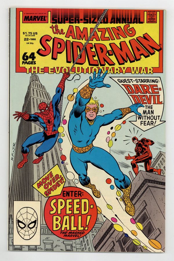 $14.50"Drug War Rages" Guest-starring Daredevil and Speedball. Part 5 of the Evolutionary War storyline. First appearance of Speedball. Plot by Tom DeFalco. Script by David Michelinie. Pencils by Mark Bagley. Inks by Mike Esposito. Cover by Ron Frenz and Joe Rubinstein. What begins as a simple drug bust in a west side warehouse...escalates into a battle atop the Empire State Building to save the lives of everyone in the Big Apple! Along the way the Amazing Spider-Man teams up with a familiar ally, the Man Without Fear; and meets a new superhero: Speedball (aka Robbie Baldwin)! The High Evolutionary wants to sterilize New York's population to eradicate DNA strands deemed to be undesirable! Can the web-slinger, Daredevil, and Speedball defeat the Purifiers and maintain the gene pool status quo? The Evolutionary War storyline continues in Fantastic Four Annual 21. Appearances by the Kingpin, Arranger, Madeline Naylor, Mary Jane Watson, Ben Urich, and J. Jonah Jameson. First backup story: "He Who Laughs..." Plot by Steve Ditko. Script by Roger Stern. Pencils by Steve Ditko. Inks by Jackson Guice. Speedball battles a crazy stagehand seeking revenge against his mother. Second backup story: "Kindred Spirits" Story by Mark Gruenwald. Pencils by Ron Lim. Inks by Tony DeZuniga. Chapter 6 of the High Evolutionary's history. Inside his Wundagore Mountain citadel, Edgar Wyndham creates Bova -- the future nanny of Quicksilver and the Scarlet Witch; and foolishly ignores Magnus' warning that the spirit of Chthon is bound to Wundagore Mountain. First backup feature: Spider-Man and J. Jonah Jameson pin-up by Larry Lieber and Frank Giacoia. Second backup feature: 2-page diagram of Peter and Mary Jane's Bedford Towers apartment. Third backup feature: Two unpublished Amazing Spider-Man covers -- the first by Larry Lieber & Jack Abel; the second by Bob Layton. (Note: Fantastic Four Annual 21 is the 6th part of the Evolutionary War storyline, but the 5th chapter of the history presented in the backup stories.) 68 pages. Cover price $1.75.