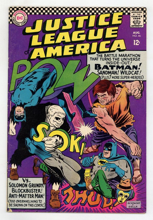 1st appearance of Silver Age Sandman. Cover pencils by Mike Sekowsky, inks by Joe Giella. Crisis Between Earth-One and Earth-Two!, script by Gardner Fox, pencils by Mike Sekowsky, inks by Sid Greene; People from Earth-1 and Earth-2 are being inexplicably transferred from one parallel world to the other, including Blockbuster and Solomon Grundy; At the same time, the Spectre discovers that the approach of the Anti-Matter Man is the reason for the transfers and will eventually cause the destruction of both worlds. 1st appearance of Silver Age Sandman. Cap's Hobby Hints by Henry Boltinoff. The Policeman Is Your Friend! public service announcement by Jack Schiff. 36 pgs. $0.12. Cover price $0.12.
