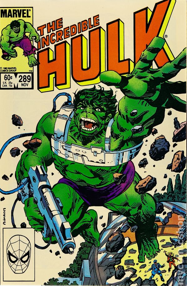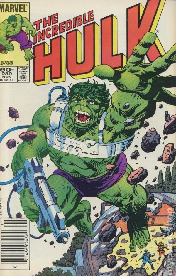 Newsstand Edition. "Call of the Desert." Guest-starring Doc Samson. Story by John Byrne. Art by John Byrne and Bob Wiacek. His long exile unexpectedly at an end, the Incredible Hulk has returned to Earth and he is not happy. As Doc Samson pursues the Green Goliath, he finds the Hulk surrounded and under siege by some of his deadliest enemies. Can even the Hulk stand against the Juggernaut, Modok, Rhino, Abomination, and the Leader? 36 pgs. Cover price $0.65.