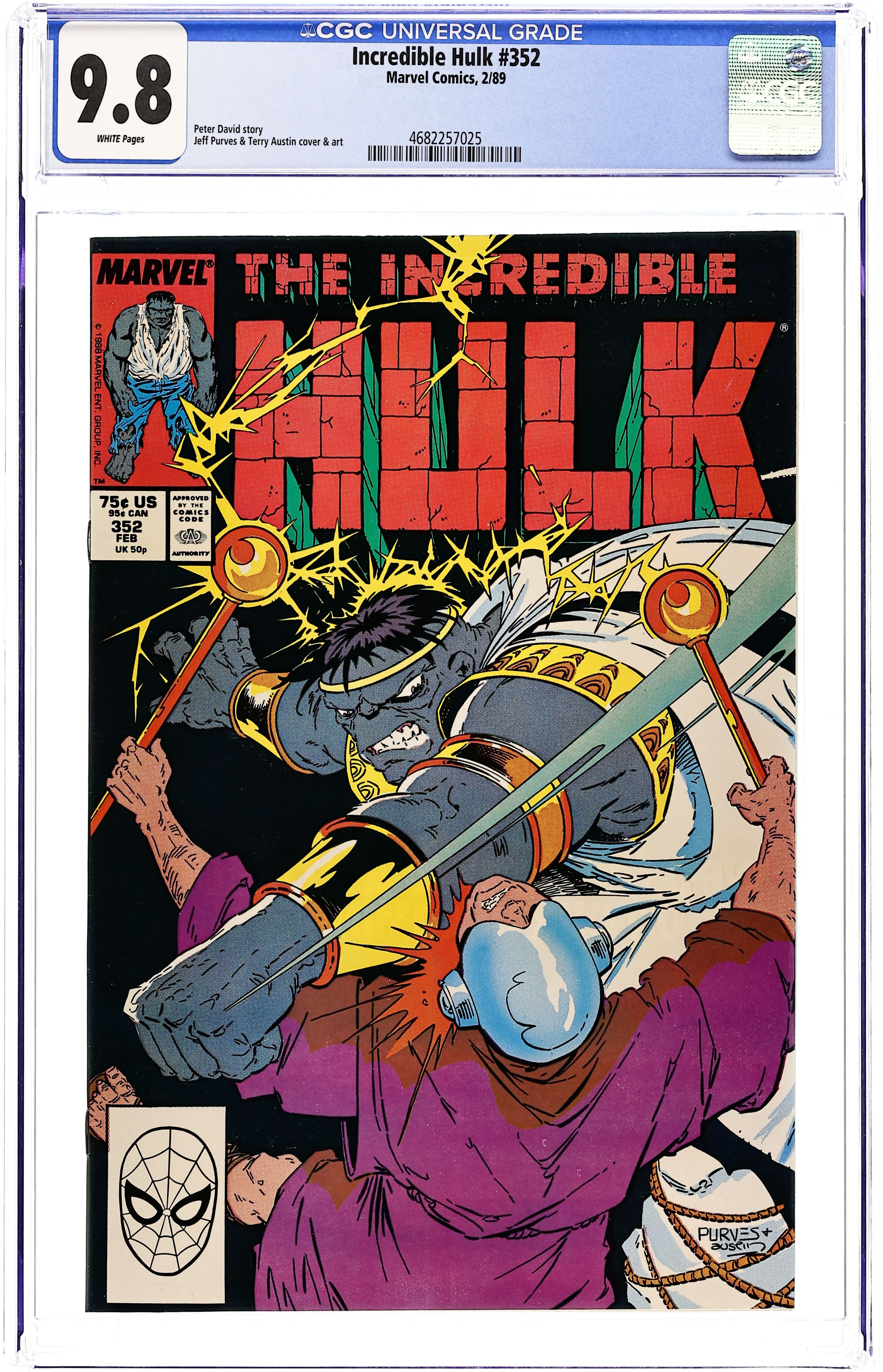 Cover pencils by Jeff Purves, inks by Terry Austin. Fervor, script by Peter David, pencils by Jeff Purves, inks by Terry Austin; As he dreams of the time he spent on Jarella's world, the Hulk agrees to overthrow the tyrant who runs a religion that worships him as a god but finds that the men he has been helping have tricked him as they simply want the power to run the show themselves; They return him to earth but have put a mojo on him to keep Banner out of the picture; Now, as three months have passed with Hulk becoming a Vegas enforcer for Berengetti, the magic wears off and he becomes Bruce Banner once again. 36 pgs. $0.75. Cover price $0.75.