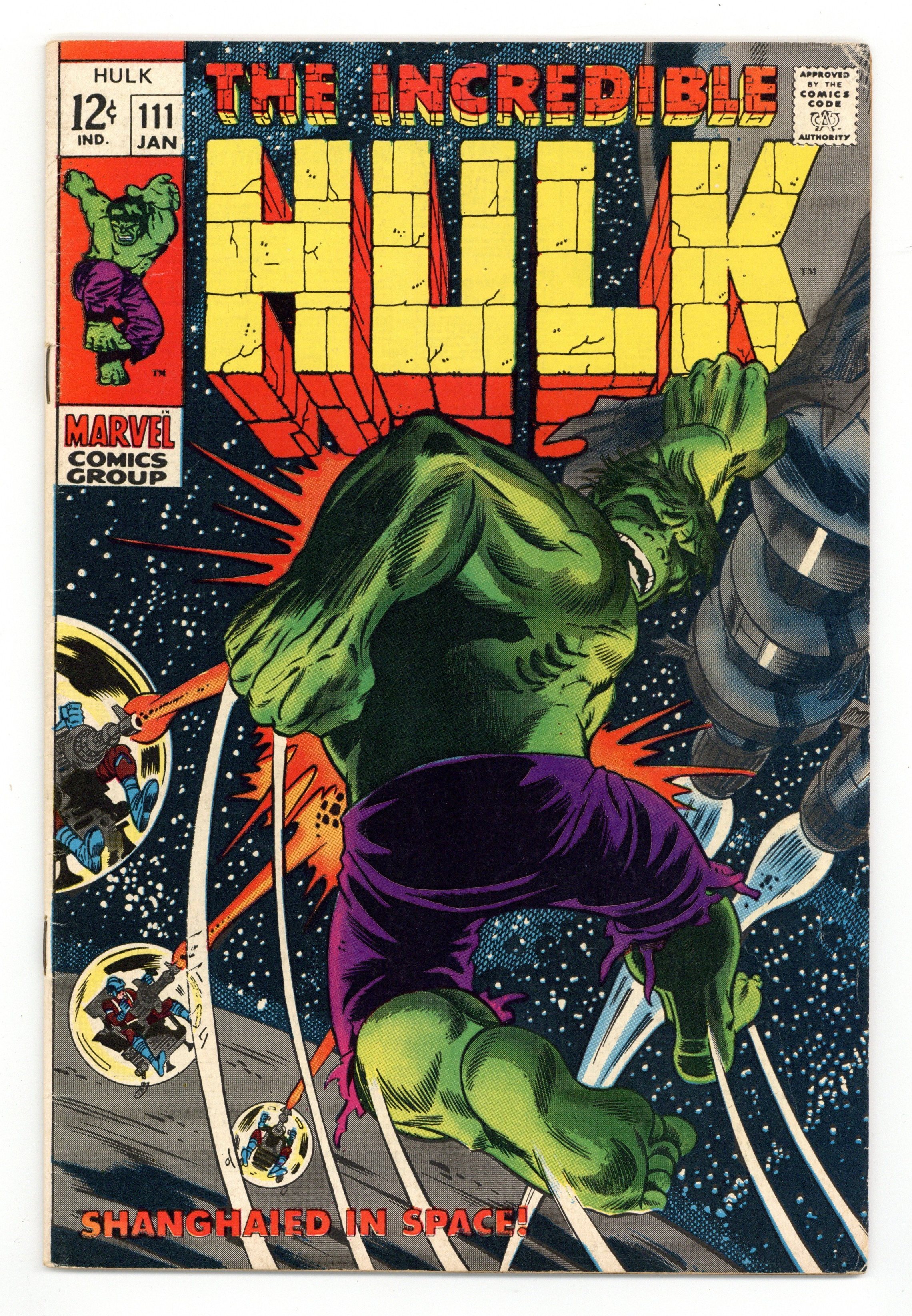 Cover pencils by Herb Trimpe, inks by Dan Adkins. Shanghaied In Space!, script by Stan Lee, pencils by Herb Trimpe, inks by Dan Adkins; The aliens who sent Umbu to destroy the earth capture Bruce Banner after the Hulk defeats their killer robot; Bringing him back to life (Bruce died at the end of last issue), the aliens find they have their hands full as they wage a pitched space battle with Bruce's alter ego, the incredible Hulk; Making it to their home planet, Hulk finds himself faced with the awesome might of the Galaxy Master. 36 pgs. Cover price $0.12.