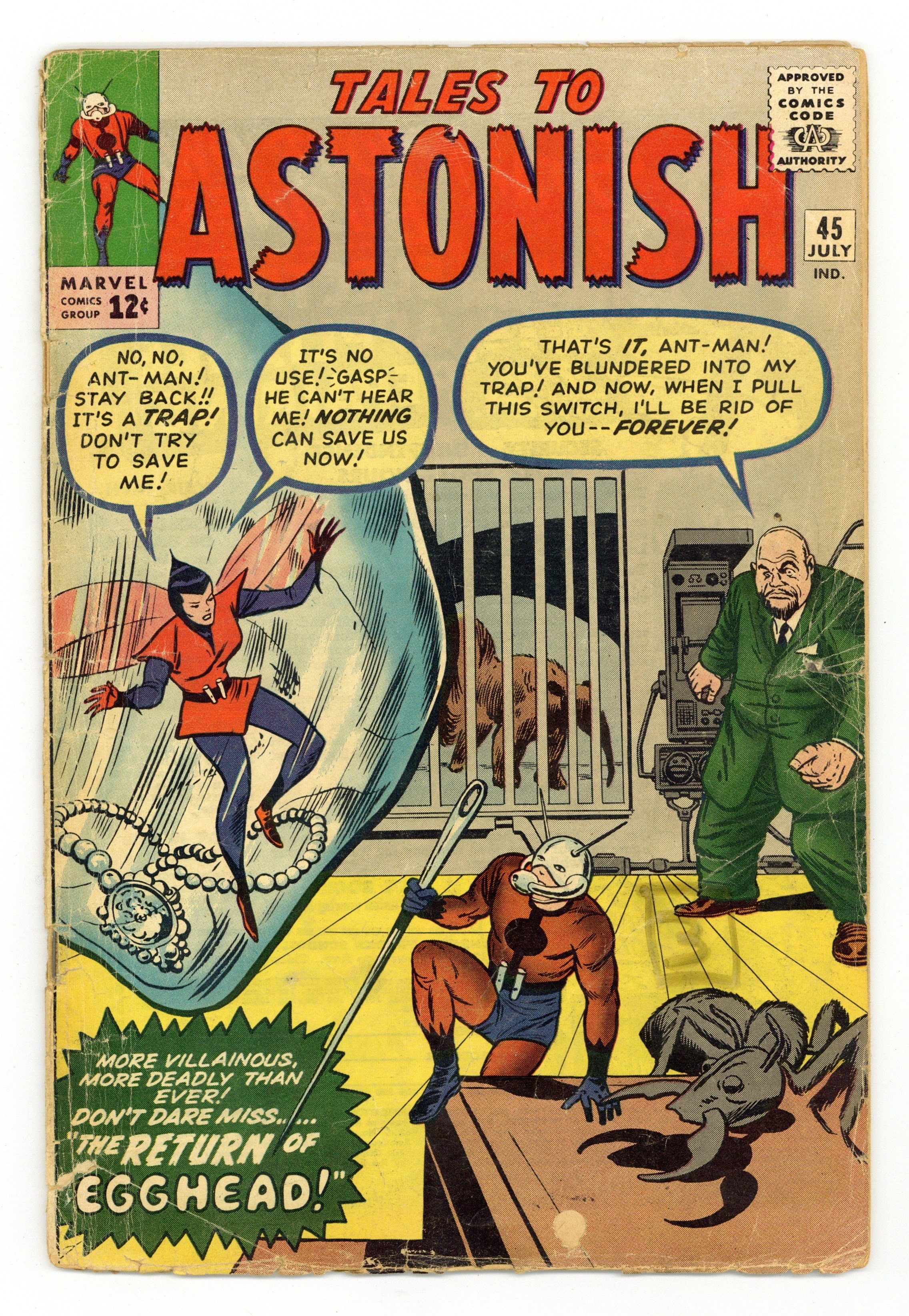 Cover by Jack Kirby and Dick Ayers. The Terrible Traps of Egghead!, script by Stan Lee and Ernie Hart [H. E. Huntley], art by Don Heck; Egghead forms a new gang and sets a trap for the Wasp, hoping to use her against Ant-Man. The Future text story. Bronson's Brain!, script by Stan Lee, art by Steve Ditko; Bronson, an incredible genius upset that no one on earth can match his tremendous intellect, builds a space ship and travels to a planet of highly advanced aliens. It Walks Like a Man!, script by Stan Lee and Robert Bernstein [as R. Berns], art by Paul Reinman; A man is disturbed by his daughter's attachment to her new robot playmate, but changes his mind when it saves her life. 36 pgs., full color. $0.12. Cover price $0.12.