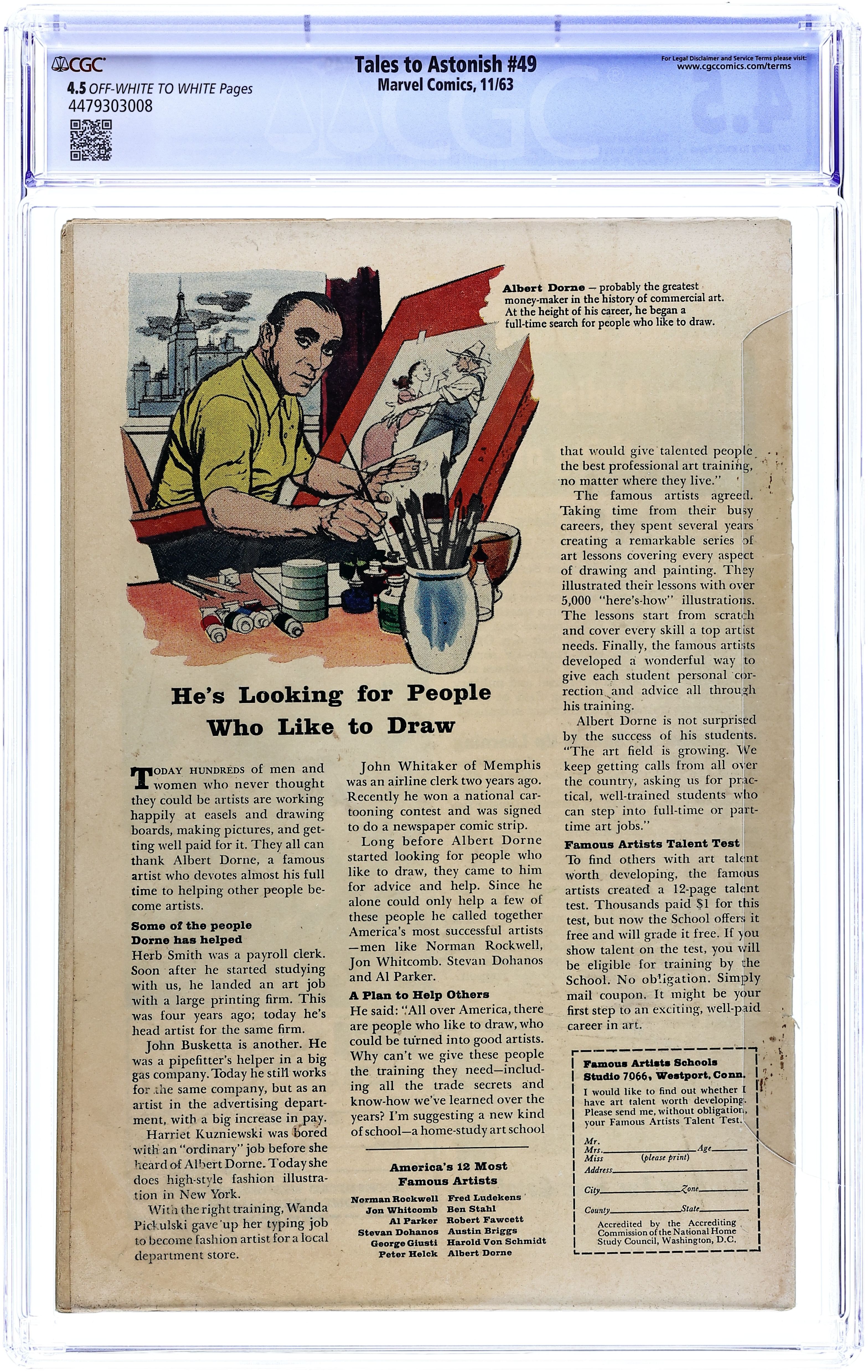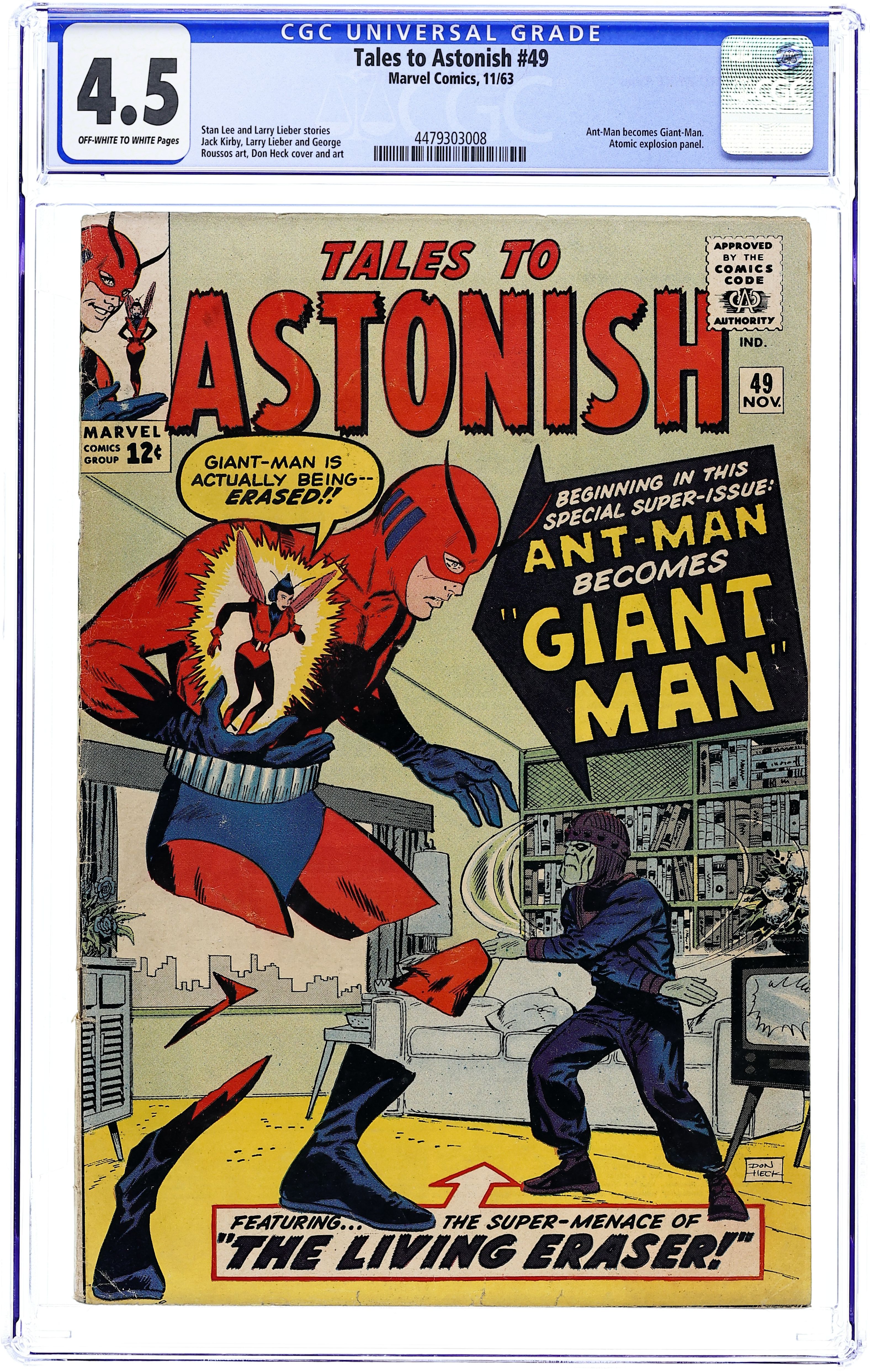 Cover by Don Heck. The Birth of Giant-Man!, script by Stan Lee, art by Jack Kirby and Don Heck; While Henry Pym develops capsules that permit him to become giant-size as well as ant-size, the Eraser captures him and brings him to Dimension Z along with other scientists to build atomic weapons. Odd Skills text story, art by Joe Maneely. The End of a World!, script by Stan Lee and Larry Lieber, art by Larry Lieber and George Roussos [as G. Bell]; A ruler orders the destruction of an uninhabited galaxy as a tribute to his power. 36 pgs., full color. $0.12. Cover price $0.12.