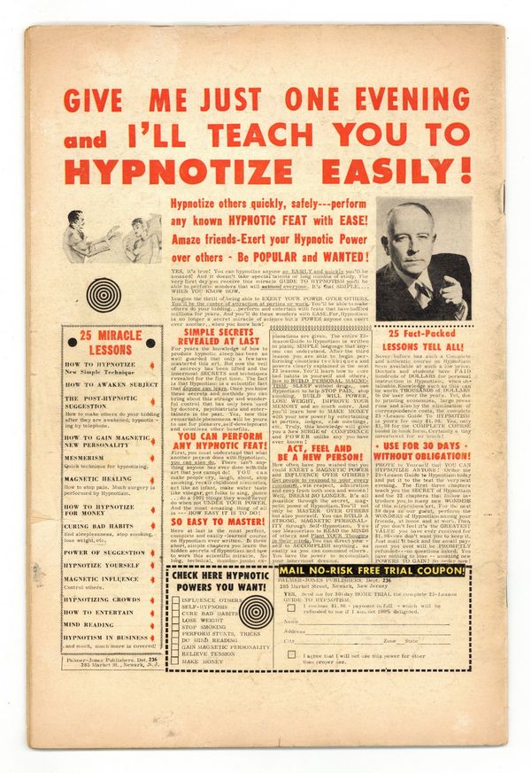Cover by Jack Kirby and George Roussos. Showdown With the Human Top!, script by Stan Lee, art by Jack Kirby and Dick Ayers; Human Top steals civil defense plans and wants to sell them to the Communists. The Sorcerer text story, art by Joe Maneely; A man who has travelled the world and seen wonders performed by hermits in India returns home to find that his young nephew creates magic with only belief. No Place to Turn!, script by Stan Lee and Larry Lieber, art by Larry Lieber and Matt Fox; Aliens transform a spy into a human, but because they can only receive black-and-white images from Earth they leave him green and he is discovered. Somewhere Waits a Wobbow!, script by Stan Lee and Larry Lieber, art by Larry Lieber and George Roussos [as G. Bell]; The Wasp tells the tale of future mercenary pilot Rack Morgan who disobeys the rules once too many. 36 pgs., full color. $0.12. Cover price $0.12.